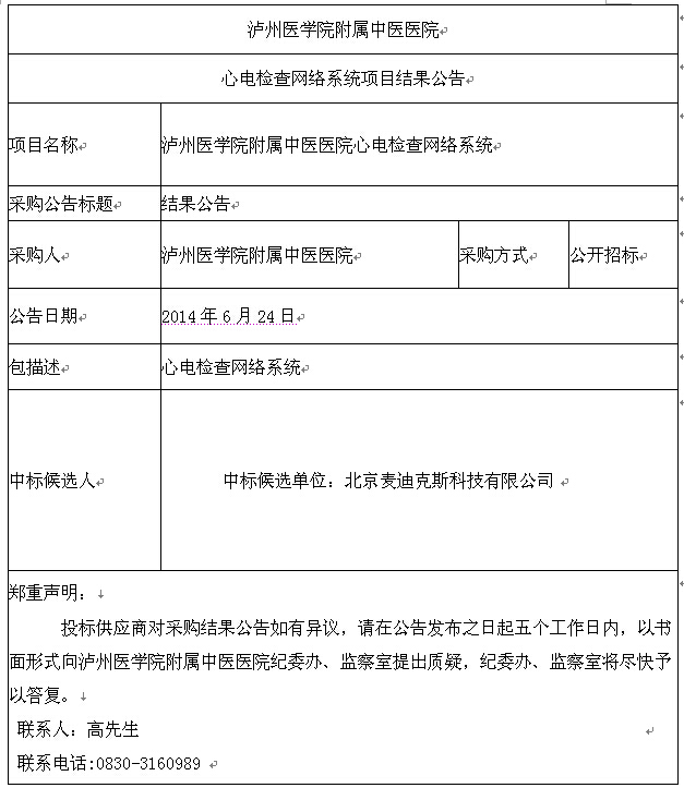 心电检查网络系统项目结果公告
