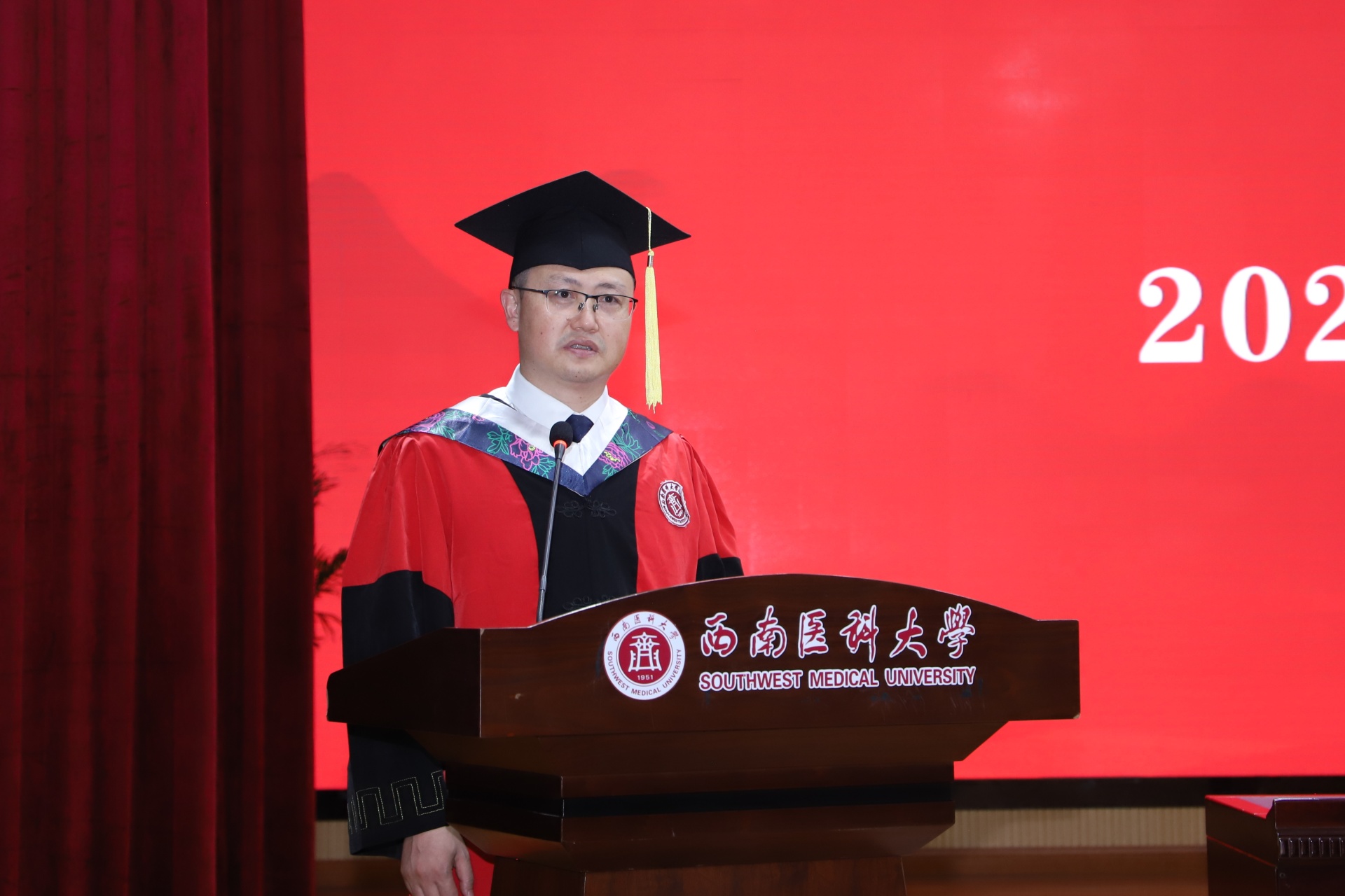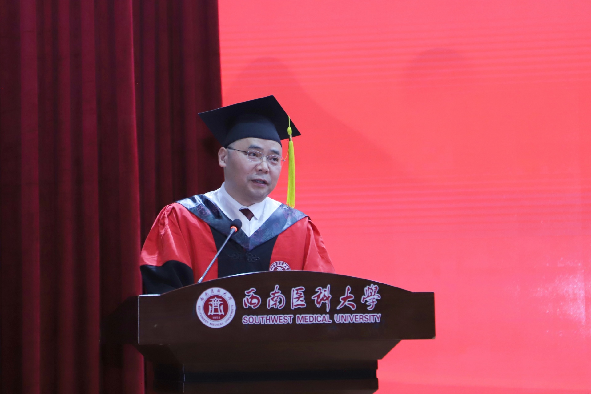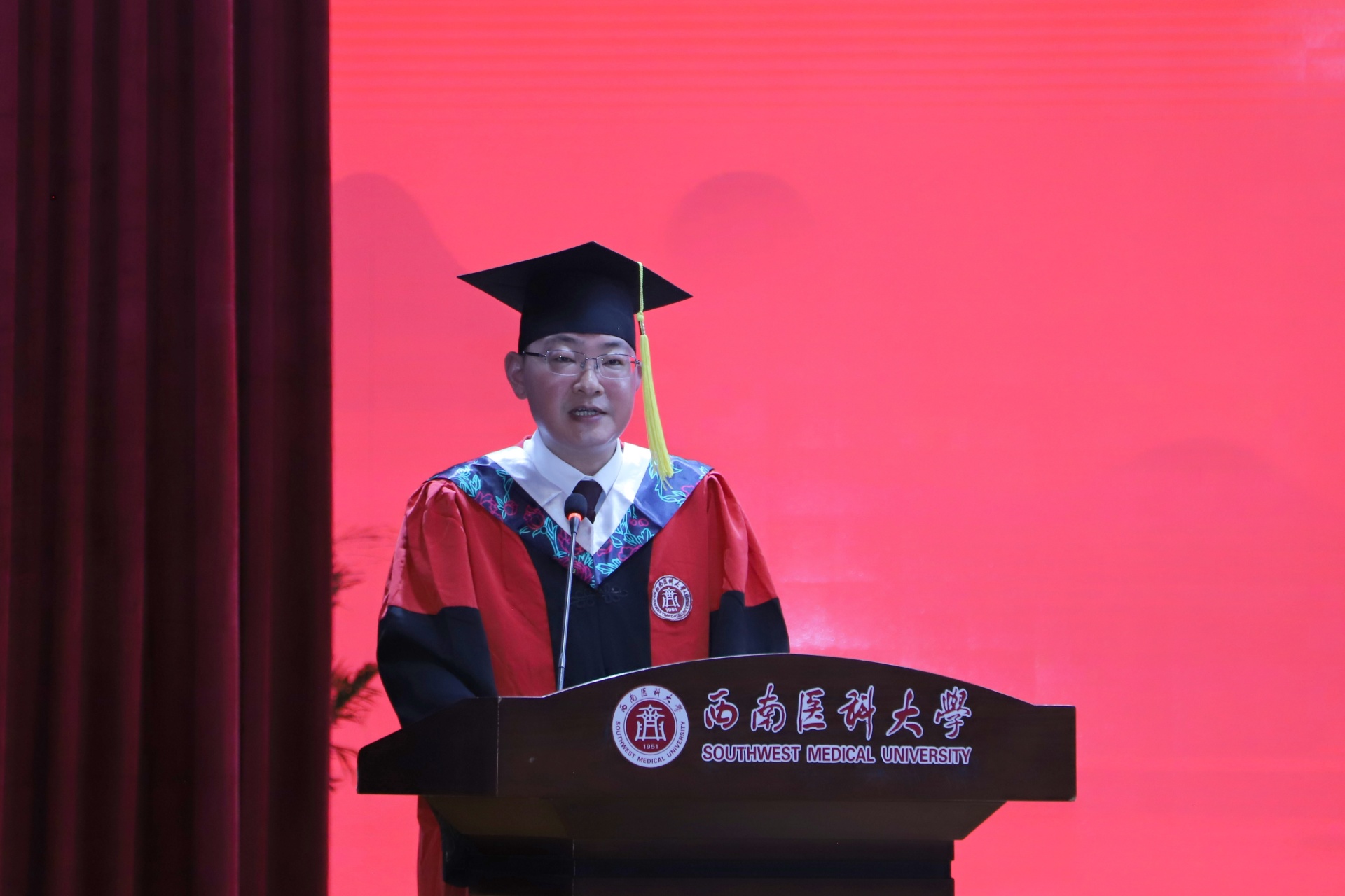 刘建讲话,他代表中西医结合学院为即将开启新征程的毕业生们送上殷殷嘱托,向悉心教导毕业生们成长成才的老师和家长们表示衷心感谢。他希望毕业生秉承西南医科大学“厚德精业 仁爱济世”的校训,不忘初心向上生长,做“肩上有担当”的人;保持匠心向内蓄势,做“手中有本领”的人;自信乐观向外绽放,做“心中有阳光”的人;在今后的道路上,不断锤炼“能干事”的本领,用厚积薄发的能力,跑出人生的“加速度”,活出精彩自我,书写灿烂人生。
