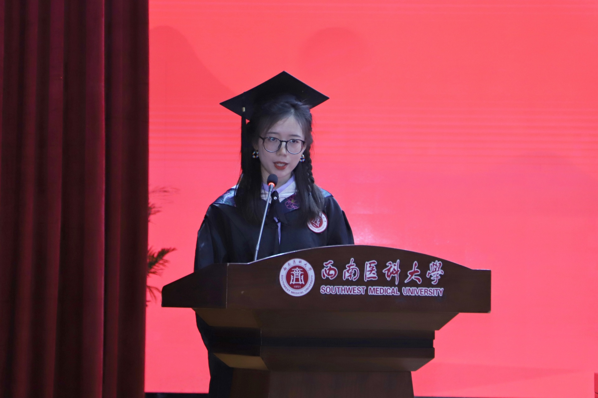 毕业生代表杨思艺代表全体毕业生诚挚感谢学校及老师的培养,表示作为西南医大中医人,会永远铭记“厚德精业,仁爱济世”的校训,勇敢地迈向新征程,用真才实学为国家、为人民服务。