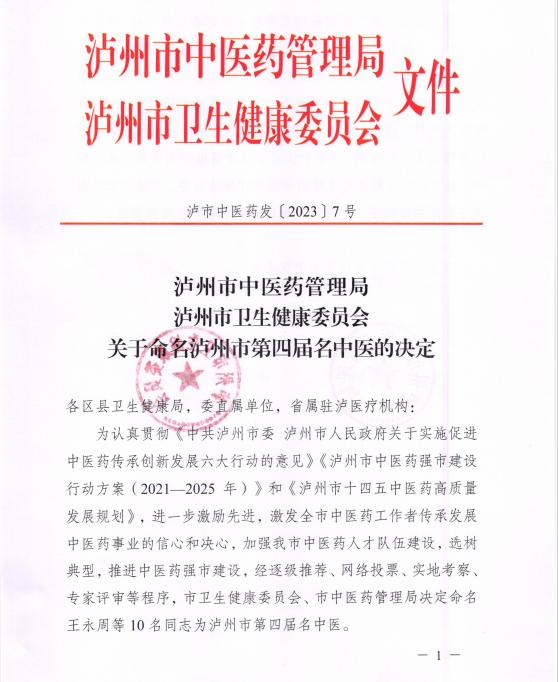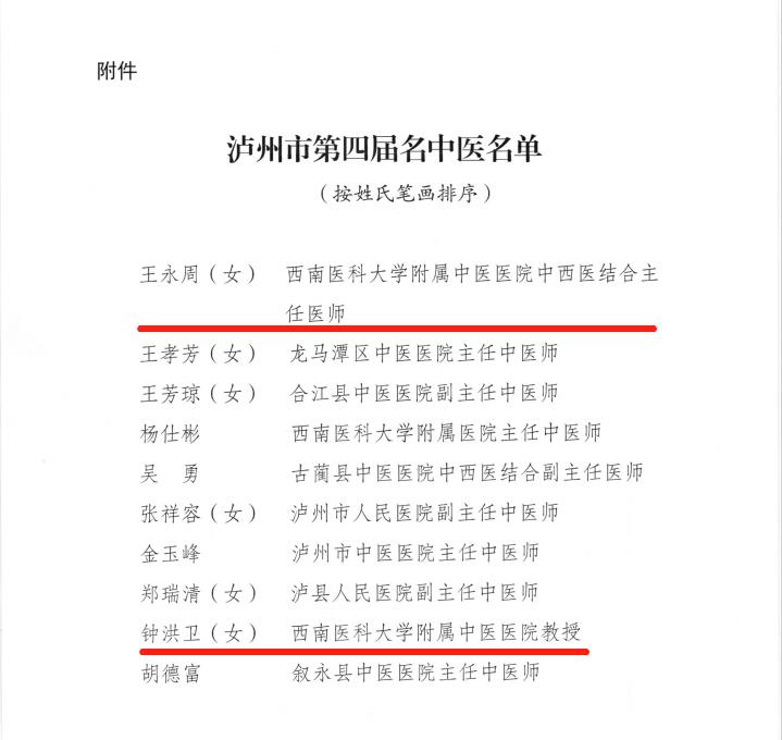 近日,泸州市卫生健康委、泸州市中医药管理局公布了泸州市第四届名中医,我院中西医结合主任医师王永周、教授钟洪卫成功获评。