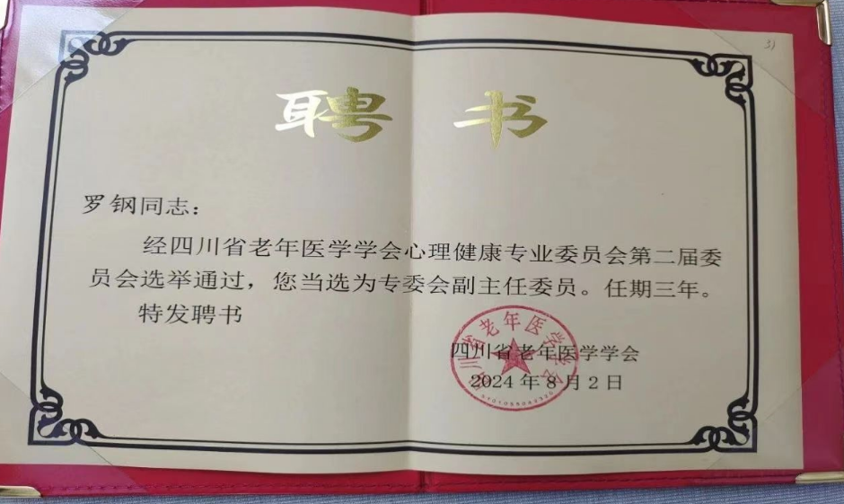 近日,经四川省老年医学学会心理健康专业委员会第二届委员会选举通过,我院心血管内科副主任罗钢教授当选为专委会副主任委员。