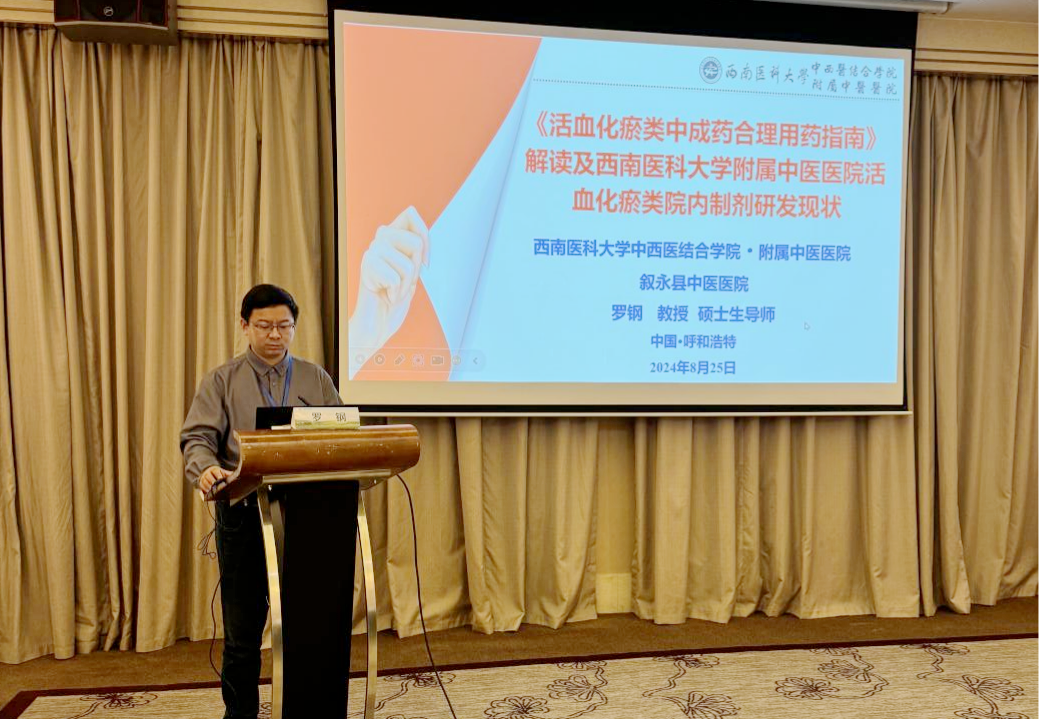 2024年8月24日,中国中西医结合学会活血化瘀专业委员会2024年学术年会在内蒙古自治区呼和浩特市召开。我院心血管内科罗钢教授作为中国中西医结合学会活血化瘀专业委员会委员参会,并受邀在分论坛“传承创新与青年论坛”上以《<活血化瘀类中成药合理用药指南>解读及西南医科大学附属中医医院活血化瘀类院内制剂研发现状》为题作了报告。