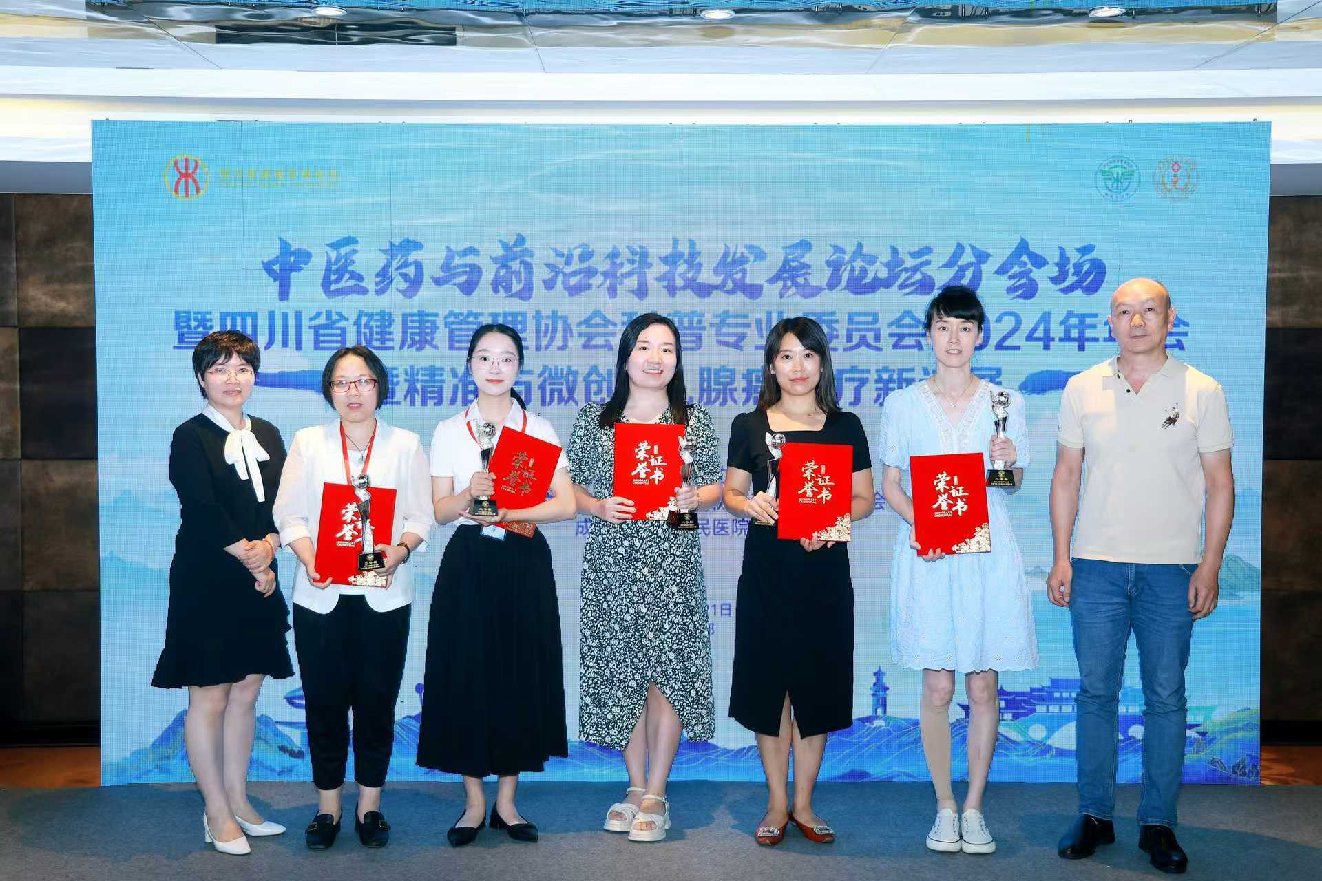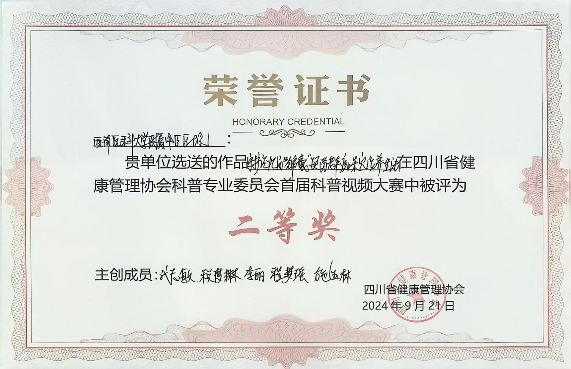 2024年9月21日,由四川省健康管理协会主办的首届科普视频大赛决赛在成都举行,经过现场专家评选,我院综合内科代志敏、税梦琳、李丽、程梦瑶、施玉林主创的科普视频《守护记忆的“锦囊”——预防老年痴呆穴位养生法 》从139个作品中脱颖而出,荣获二等奖。
