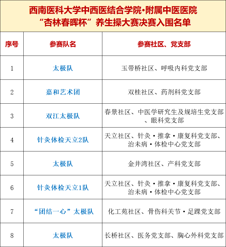 据悉,医院今年4月启动“杏林春晖杯”养生操大赛以来,医院各党支部联合对口社区党委组织社区群众积极参与,共组建了18支队伍参赛,目前已完成初赛和半决赛,总决赛将于10月底在江阳公园进行。