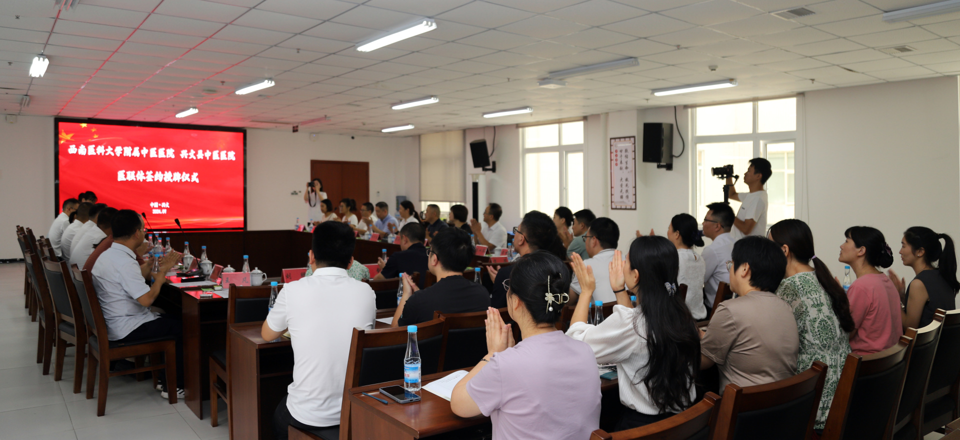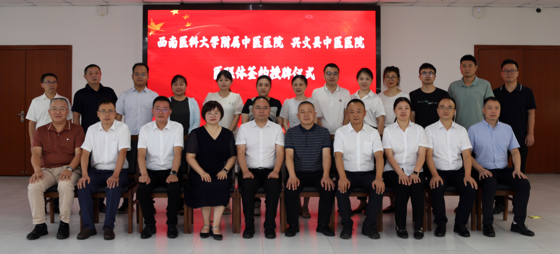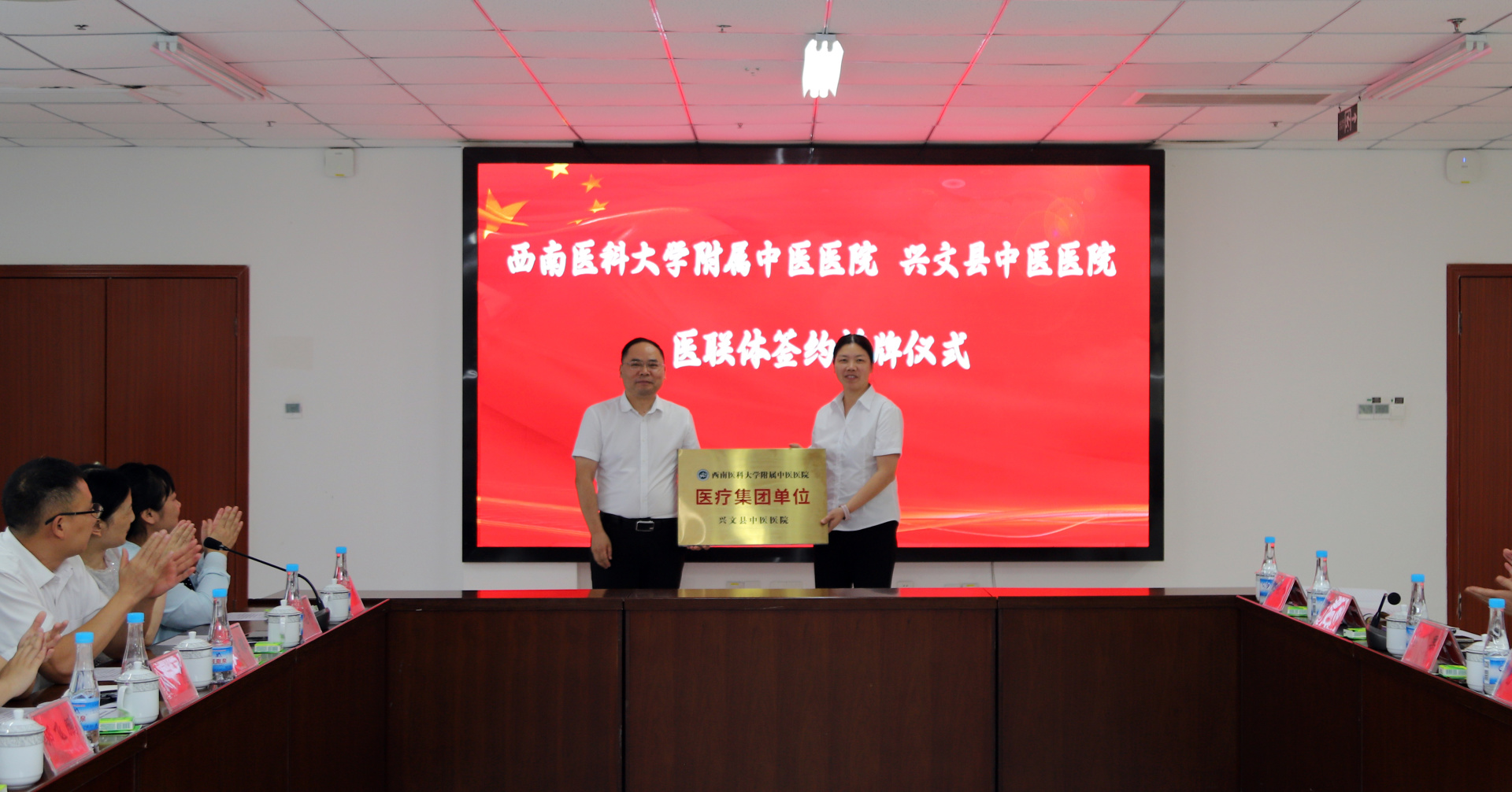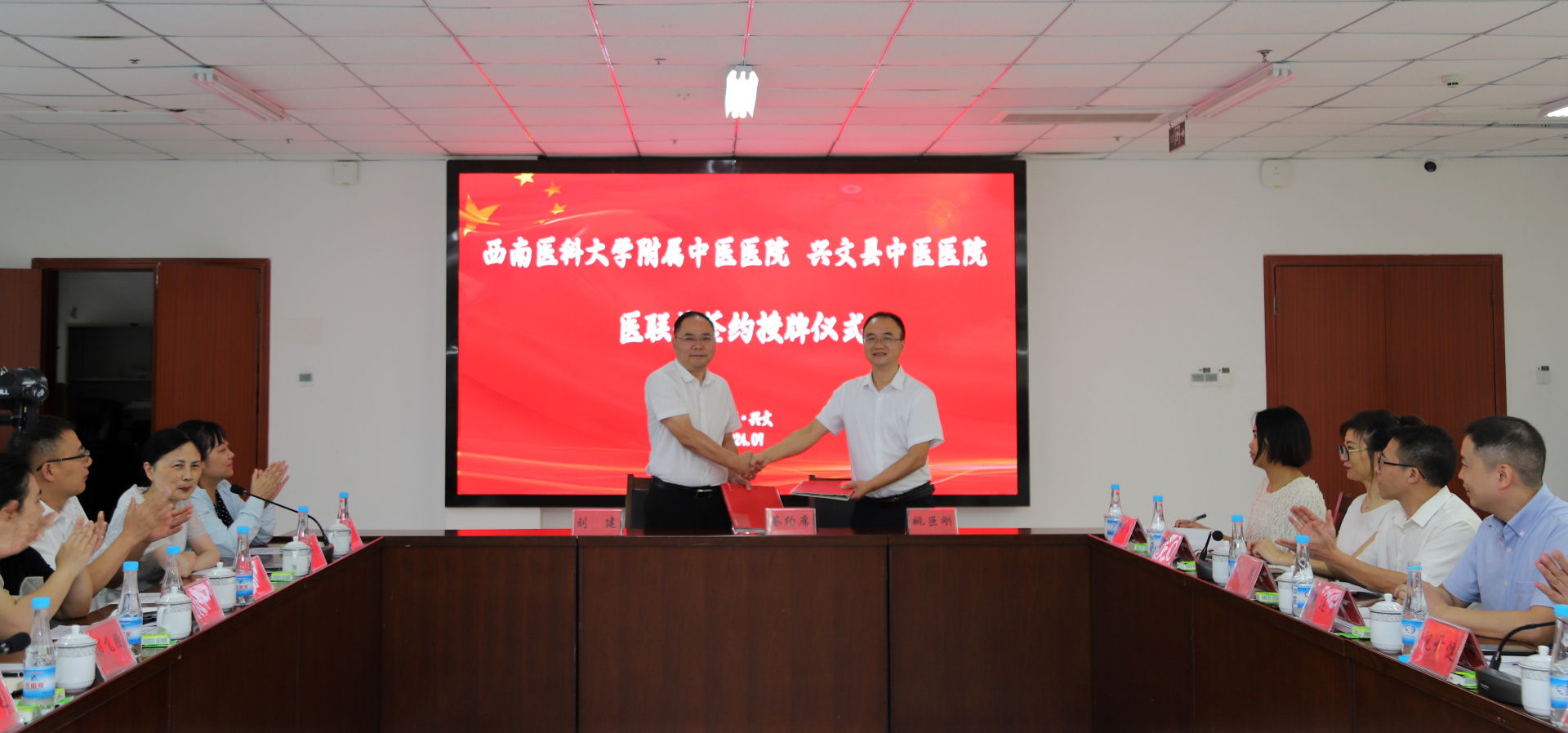 2024年9月25日,我院与兴文县中医医院举行签约授牌仪式,我院院长刘建、党委副书记兼纪委书记鄢飞鹏、副院长徐厚平,兴文县人大常委会党组成员、副主任戴林冲,兴文县卫生健康局副局长刘旭莉,兴文县中医医院党委书记祝开健、院长姚巨刚等班子成员及职能部门负责人等参加了仪式。