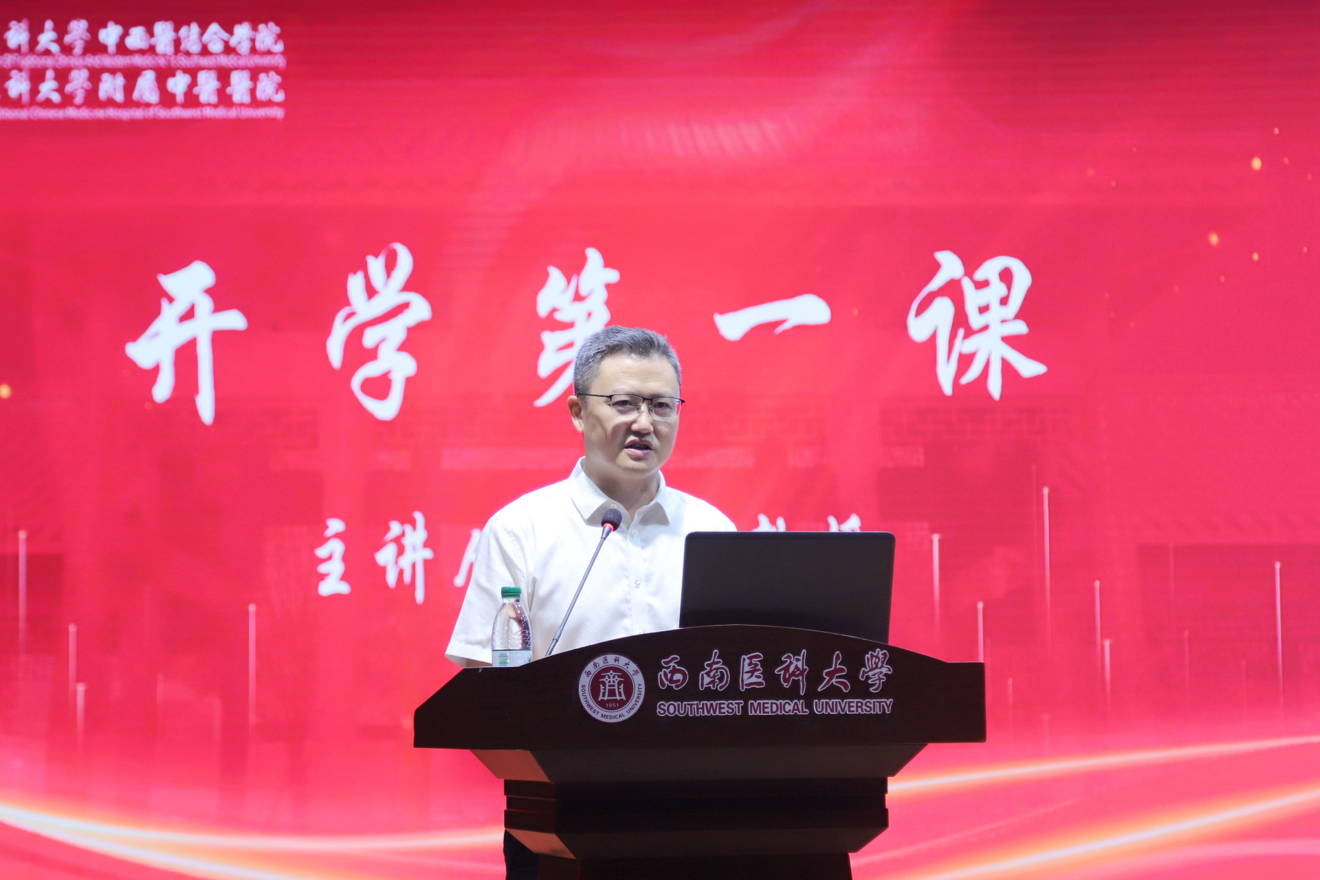党委书记李志以“自信自强 挺膺担当 奋力书写新时代青春美好篇章”为主题讲授《开学第一课》,他向同学们详细介绍了中西医结合学院·附属中医医院发展历程、教育教学特色及育人工作成效,并希望同学们要自觉自律,做医大学子的优秀生;要自信自强,做传承中医的追梦人;要自我超越,做青春年华的奋斗者。