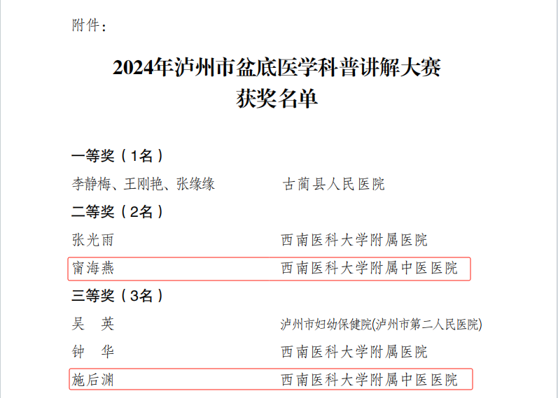 2024年9月20日,泸州市医学会盆底医学专业委员会举办了2024年泸州市盆底医学科普讲解大赛,全市各级医疗机构的妇产科、康复科及临床专业人员参加了活动。经过现场激烈角逐,我院妇科甯海燕医生荣获二等奖、产科施后渊医生荣获三等奖。