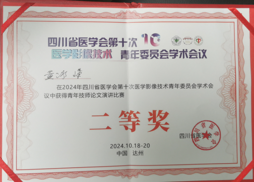 10月18-20日,四川省医学会第十次医学影像技术青年委员学术会议在达州召开,放射影像科核磁共振组黄冰峰主管技师荣获大会青年技师论文演讲比赛二等奖。