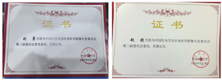 2024年9月28-30日,2024年中国针灸学会年会在天津召开,我院放射影像科磁共振组刘勇教授当选为中国针灸学会针灸医学影像专业委员会第三届委员会常务委员、赵捷博士当选为委员。