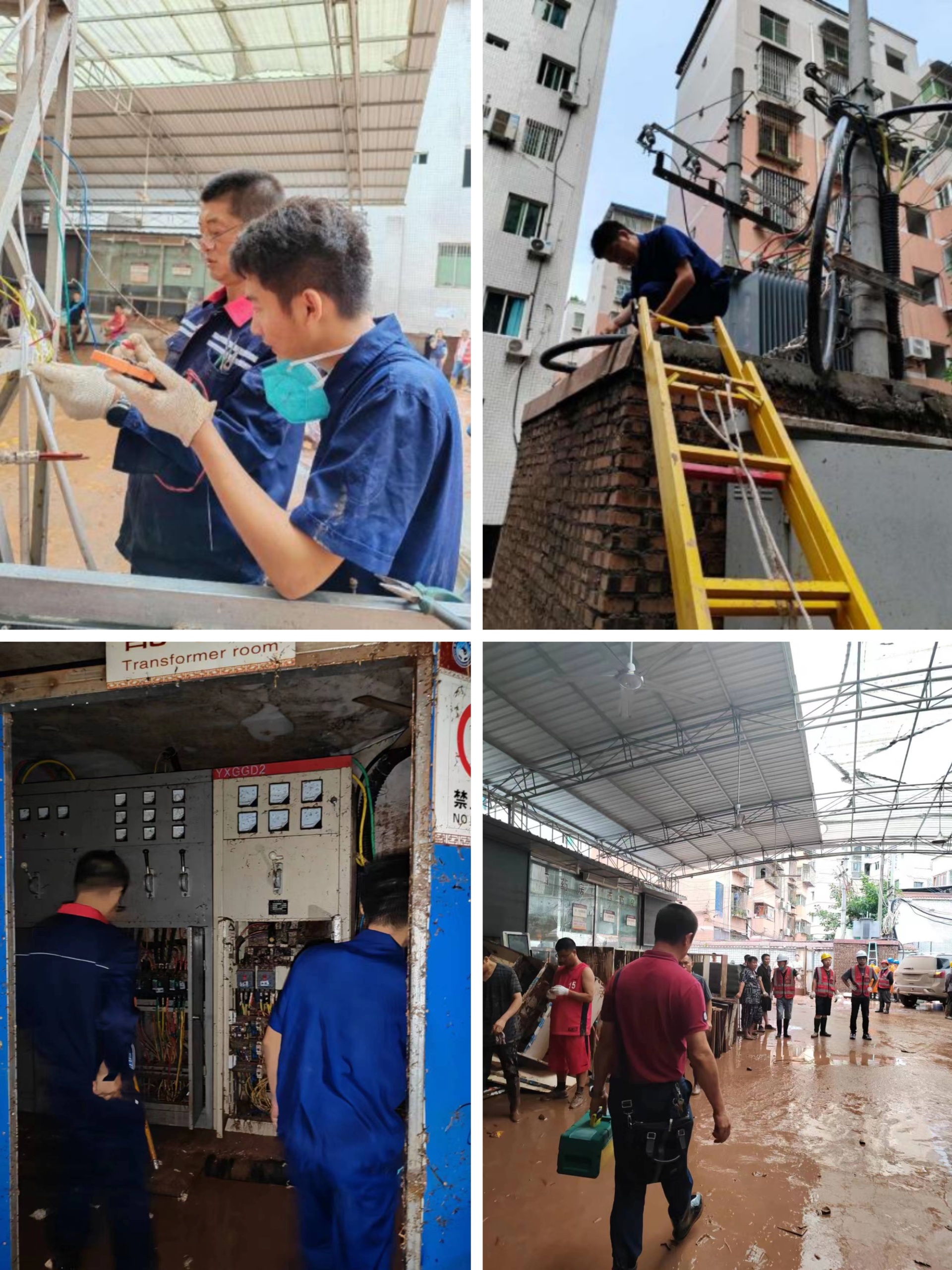 3名工程师到达现场后立即加入抢修抢检队伍,勘察现场配电设备、发电机被淹情况,了解变压器容量和楼层配电箱分布情况,积极和国网电力抢修队一起快速恢复未受灾楼层供电,敷设临时照明线路,安装控制开关等,第一时间完成抢修复电。