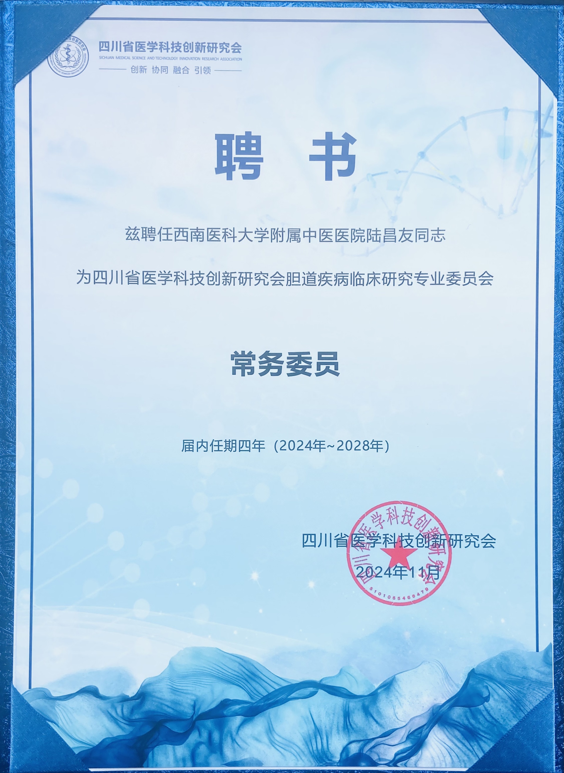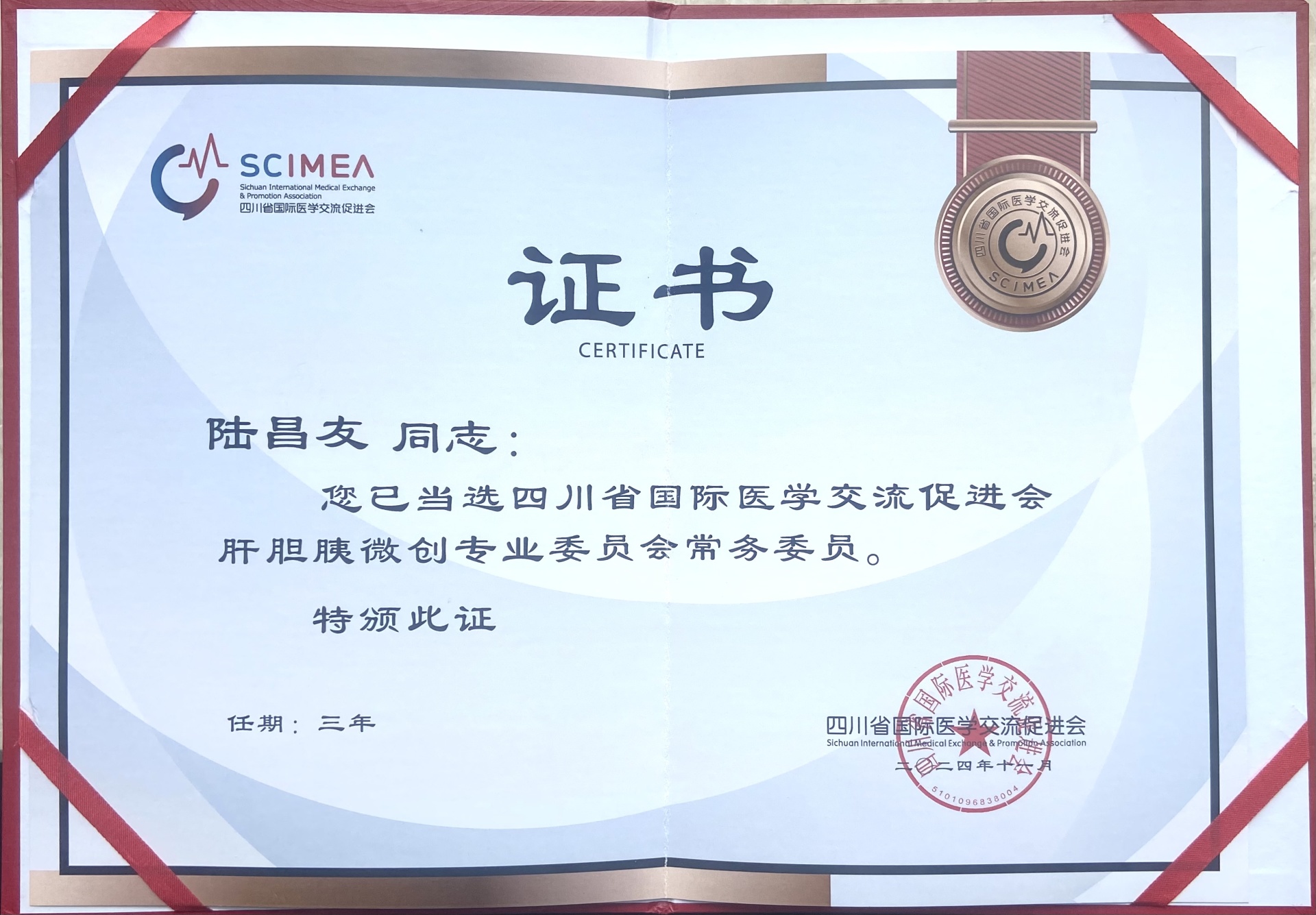 2024年11月1-2日,天府胆道肿瘤微创学术大会暨四川省医促会肝胆胰微创专委会首次学术会议在成都世纪城国际会议中心召开。我院肝胆胰外科主任陆昌友教授受邀担任会议主持,并作了《腹腔镜胰十二指肠切除术中放置胰管支撑管的争议与思考》专题讲座,同时当选为四川省医学促进会肝胆胰微创专业委员会常务委员和四川省医学科技创新研究会胆道疾病临床研究委员会常务委员。