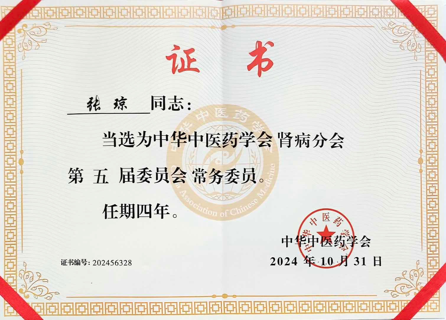 2024年10月31日-11月2日,中华中医药学会肾病分会2024学术年会暨换届选举会议在河南省郑州市召开。会上,我院肾病科主任张琼教授当选为中华中医药学会肾病分会第五届委员会常务委员;并作了《隐秘的过敏原——血液透析中的生物相容性问题》为题的学术报告。