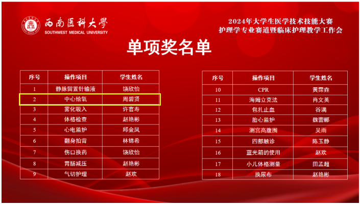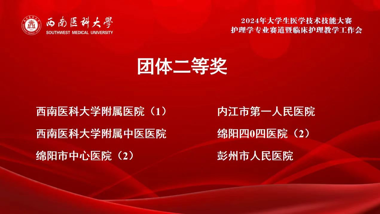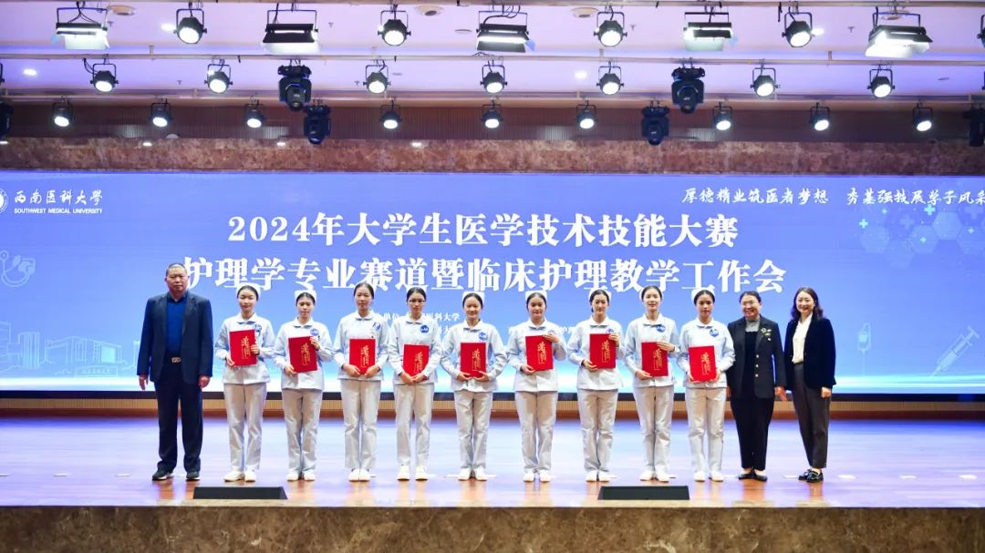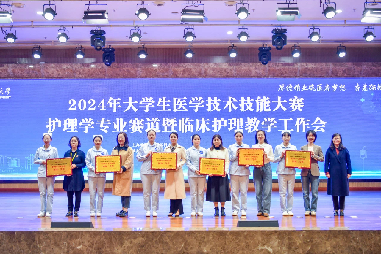 2024年11月7日,西南医科大学2024年大学生医学技术技能大赛(护理学专业赛道)在城北校区举行,来自省内外22家教学基地医院的28支队伍共111名参赛选手参加了此次比赛。经过激烈角逐,我院参赛队的四名实习生以优异成绩进入决赛,荣获团体二等奖,其中周碧贤获中心给氧操作单项奖。