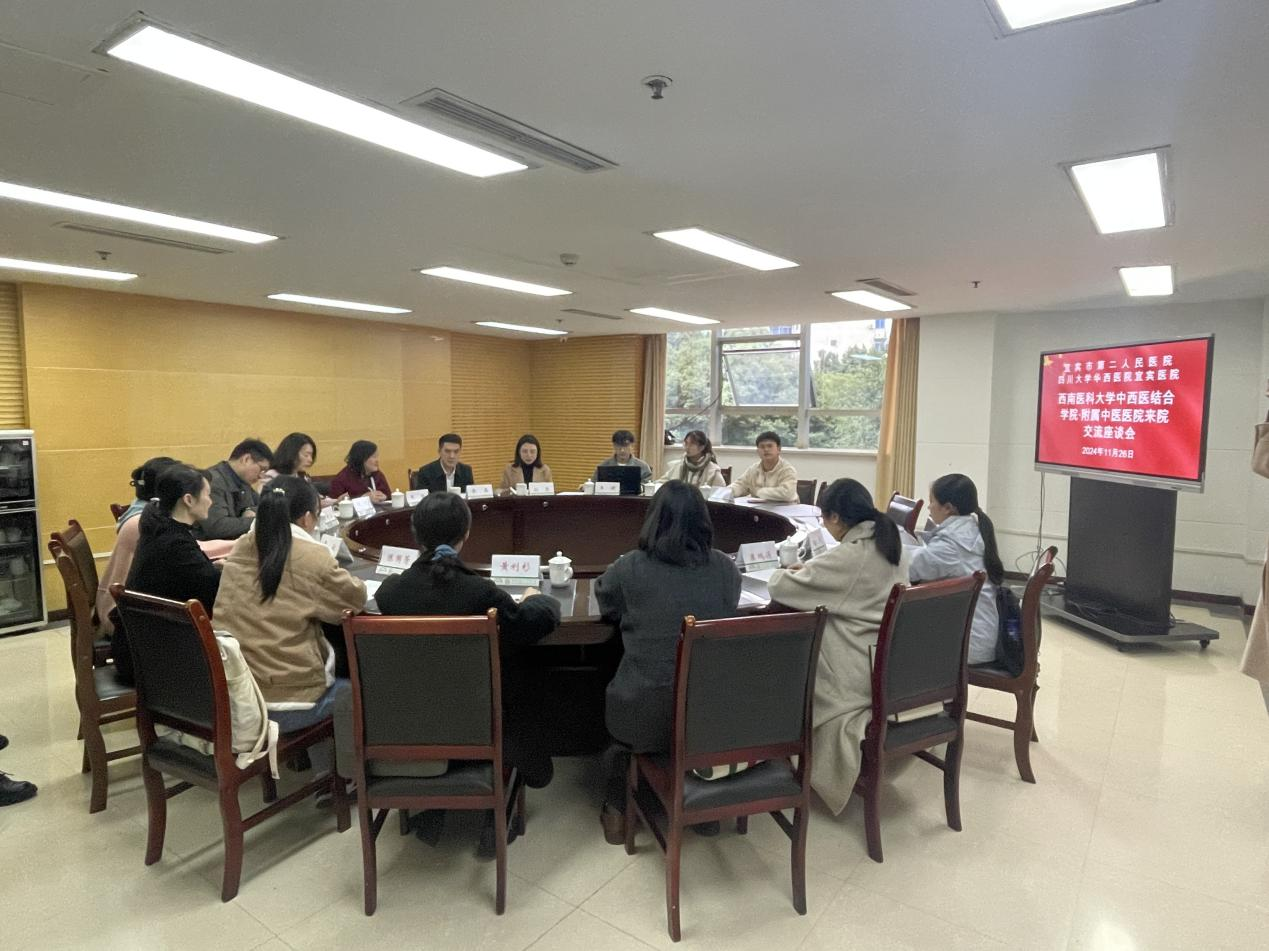 2024年11月26日,我院副院长张磊带领学科建设办公室人员及中西医结合学院硕士研究生到江安县中医医院、宜宾市第二人民医院开展了“访企拓岗”调研活动。江安县中医医院副院长田元高、副院长王勇,宜宾市第二人民医院副院长张捷及相关职能部门负责人参加本次活动。与会人员就医院建设、人才政策及岗位需求等进行了交流座谈,并开展了毕业研究生回访。