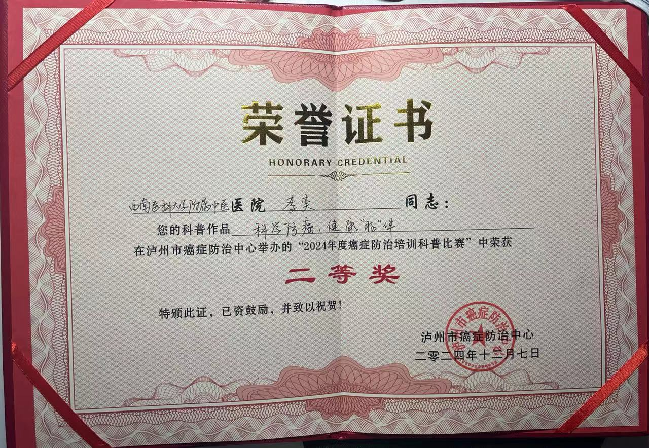 2024年12月7日,由泸州市癌症防治中心主办的2024年度癌症防治培训科普比赛在泸州举行,我院肿瘤·血液病科研究生李奕的科普作品《科学防癌,健康“肠”伴——如何做好肠癌的三级预防》荣获二等奖。