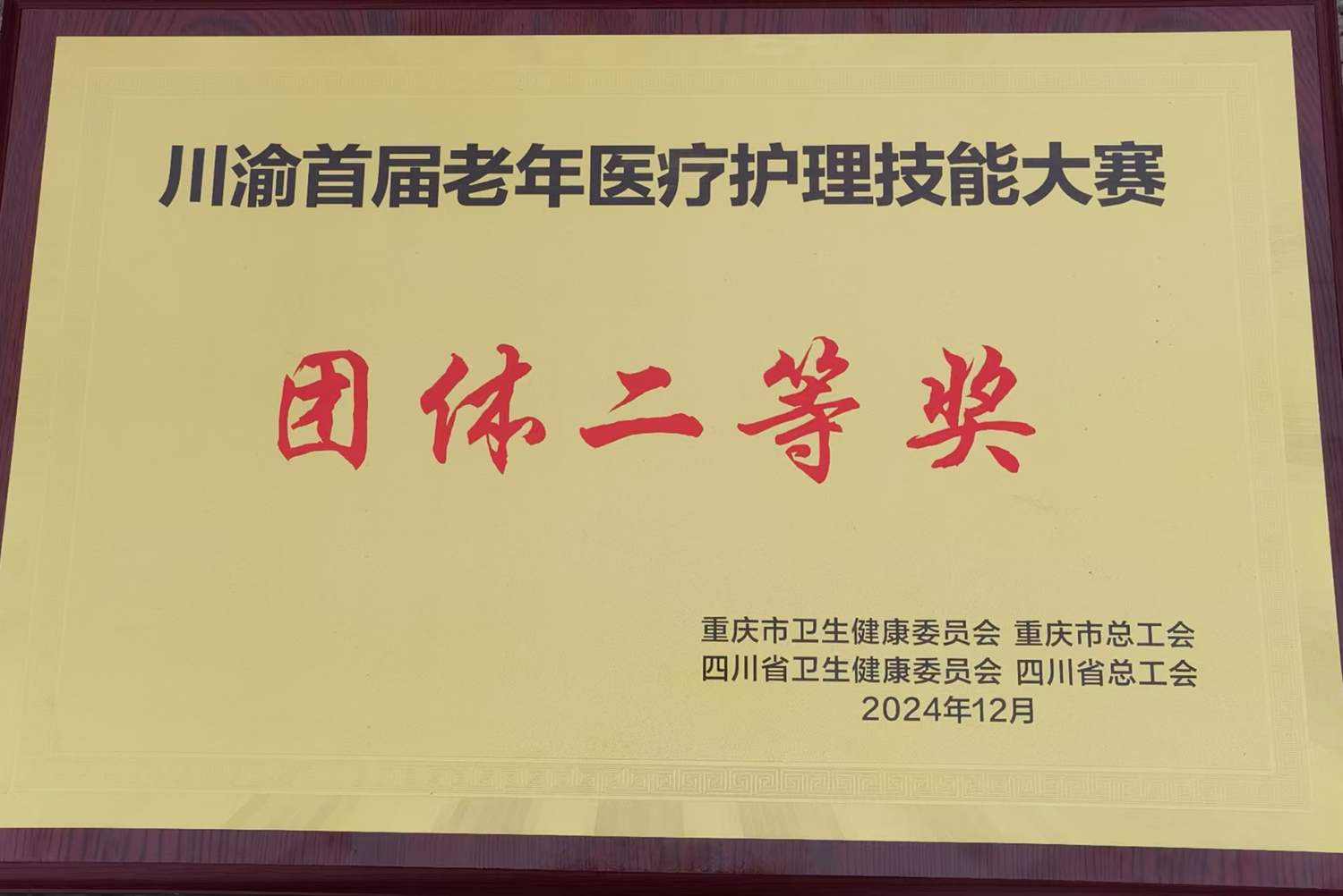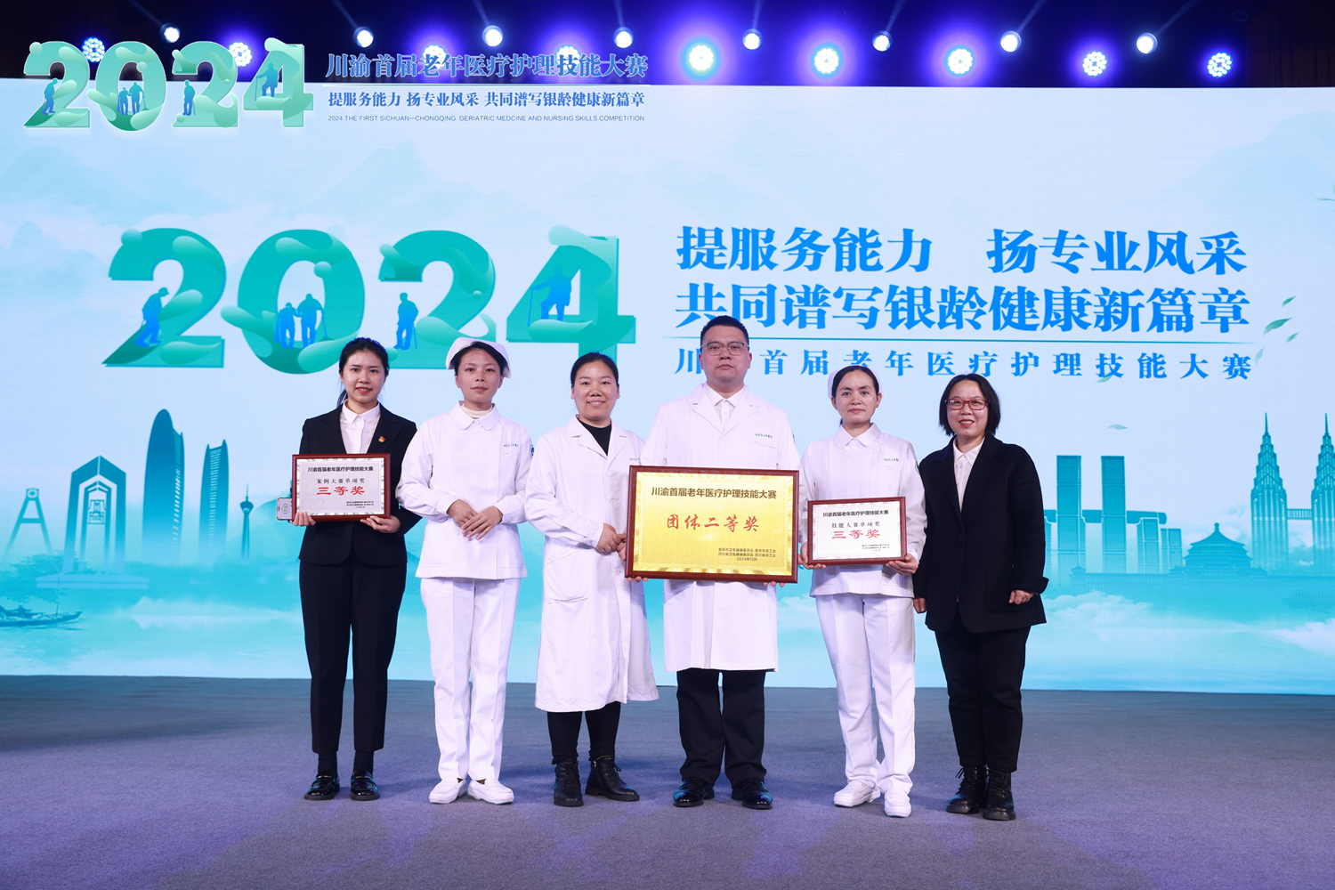 2024年12月11-12日,川渝首届老年医疗护理技能大赛决赛在重庆举行,来自川渝地区共36家医疗单位参加了决赛。我院由综合内科代志敏(领队),心血管内科胡钟竞、郑雪梅,针灸·推拿·康复科马婷,老年病科胥青梅、张正群组成的参赛团队代表医院参加了比赛。