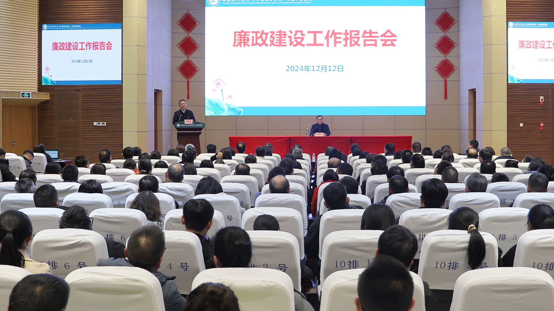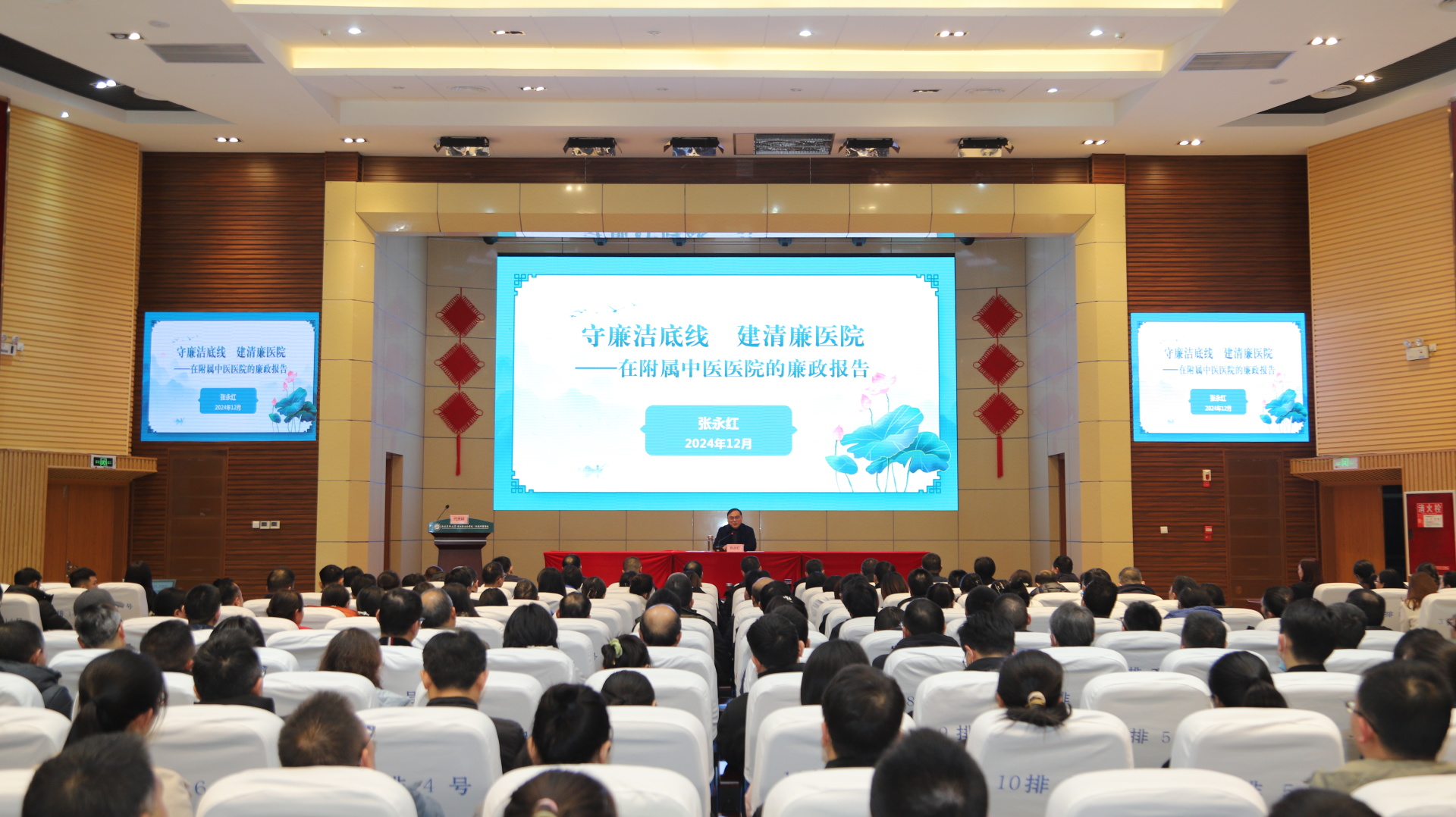 张永红以“守廉洁底线 建清廉医院”为题作报告。报告以习近平新时代中国特色社会主义思想为指导,深刻认识党的十八大全面从严治党取得的新成效,深刻领会反腐败形势依然严峻复杂,深刻把握健全全面从严治党体系新要求,要求全院职工提高站位、统一思想,切实增强使命感和责任感;深入剖析了近年来医院线索处置和案件查办中发现的典型问题,警醒与会人员要时刻保持清醒的头脑,认清形势、正视问题,切实增强责任意识和忧患意识。他希望,医院要认真落实党委主体责任、纪委监督责任、党委书记第一责任、班子成员“一岗双责”,全院职工要讲政治、存仁心、提能力、善创新、严自律,持续推动传统中医药和现代医学相融互促,为学校早日建成特色鲜明的西部高水平医科大学、为医院早日建成国内一流、国际知名的中医、中西医结合现代化研究型医院贡献力量。