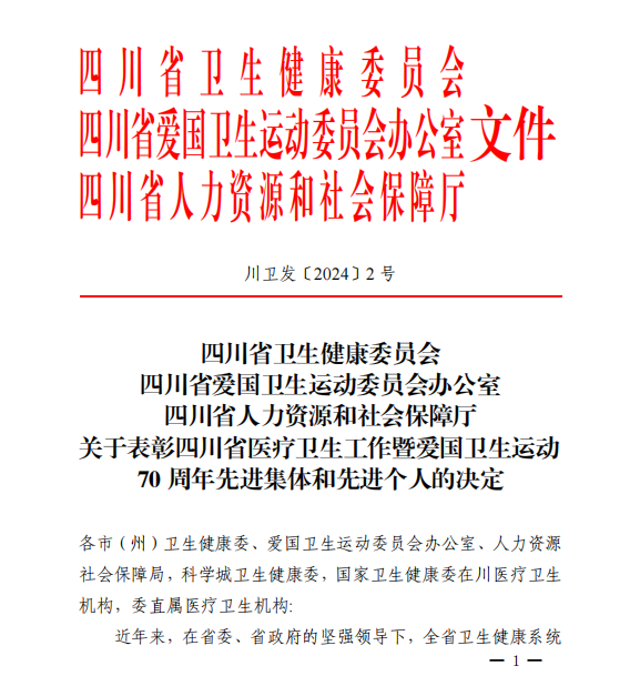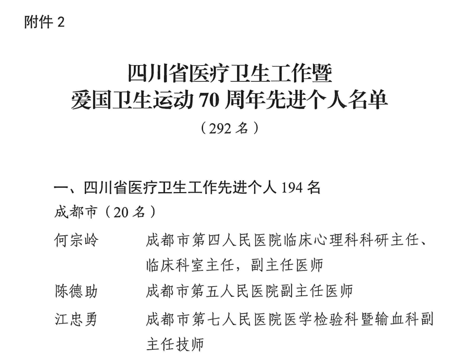 近日,四川省卫生健康委员会、四川省爱国卫生运动委员会办公室、四川省人力资源和社会保障厅联合发布了《关于表彰四川省医疗卫生工作爱国卫生运动70周年先进集体和先进个人的决定》,我院城北急诊科副主任刘操副教授被授予“四川省医疗卫生工作先进个人”称号。