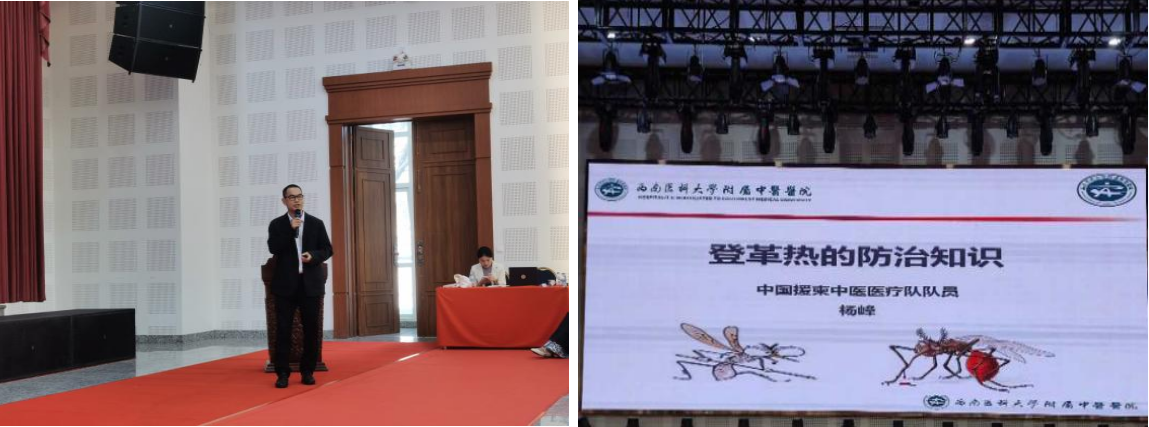 培训会上,我院呼吸内科医生杨峰作为援柬埔寨中医医疗队队员作了《登革热的防治知识》科普讲座。他引经据典,向参训者普及了登革热的危害、流行病学、发病流程、临床表现、如何预防及治疗登革热、中医对登革热的认识情况及中医“治未病”理念等。