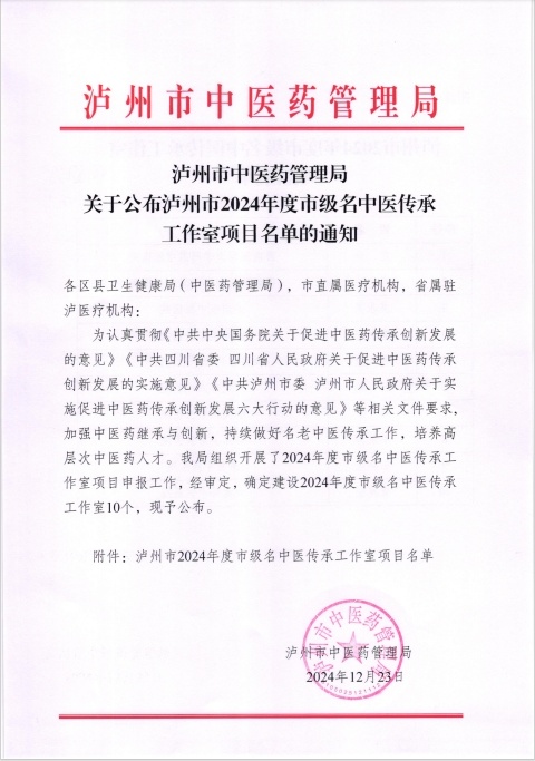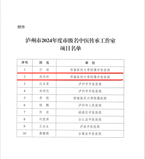 近日,泸州市中医药管理局发布了《关于公布泸州市2024年度市级名中医传承工作室项目名单的通知》,我院庄诚教授、冉志玲教授的申报项目获批。