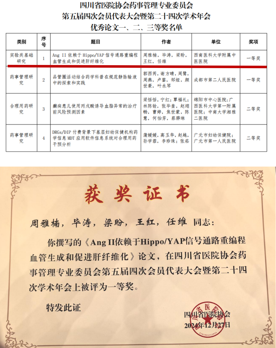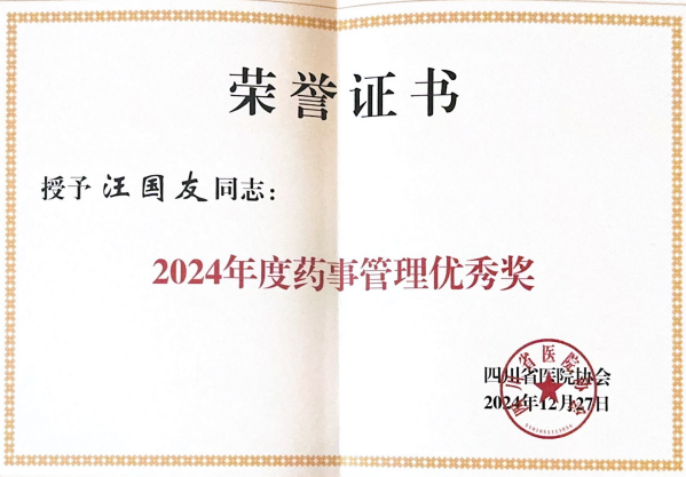 会上,四川省医院协会发布了2024年度医院药事管理和药剂科管理优秀奖的评选结果。我院副院长汪国友荣获医院药事管理优秀奖,全省仅2人获得该奖项。
