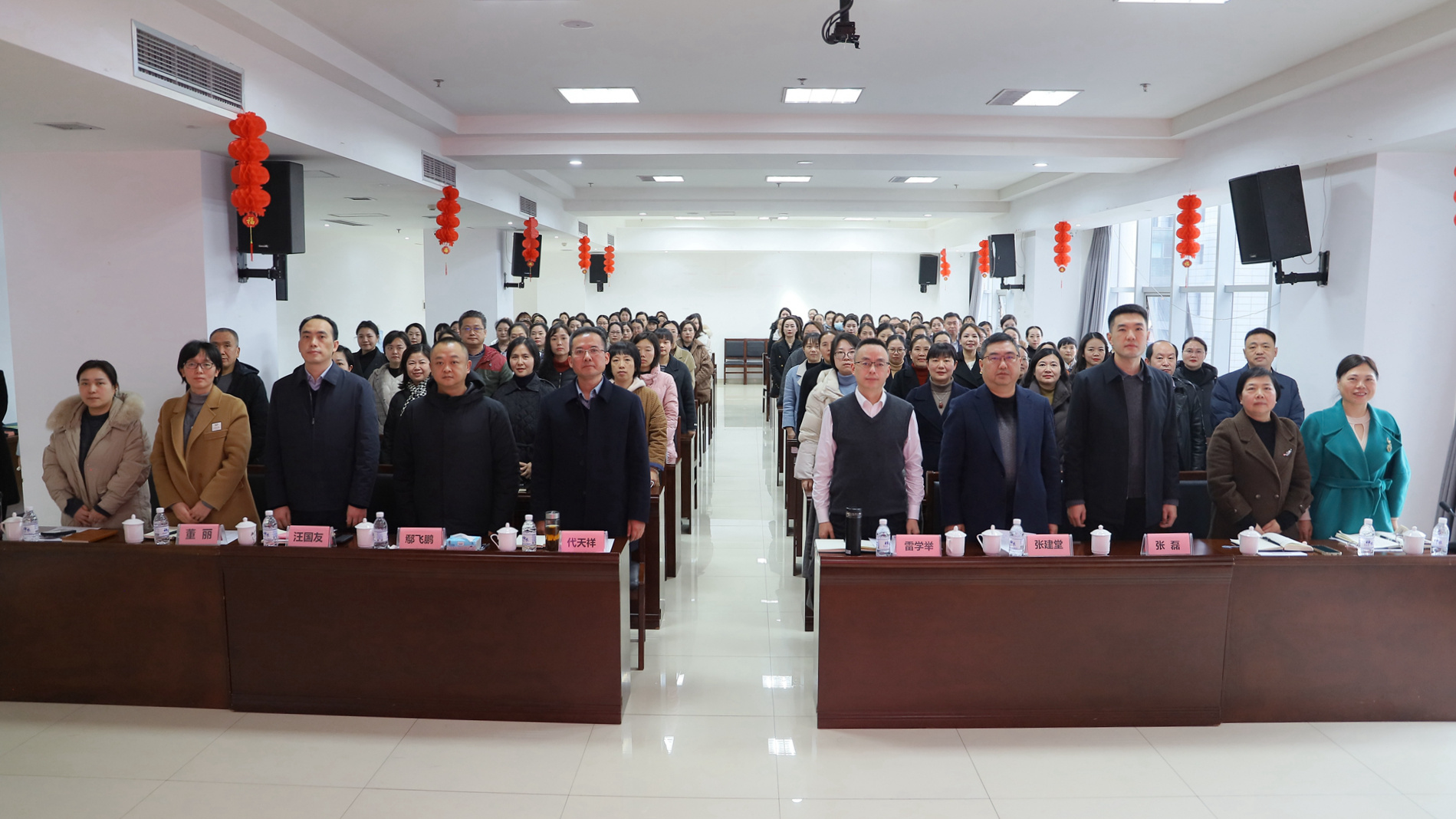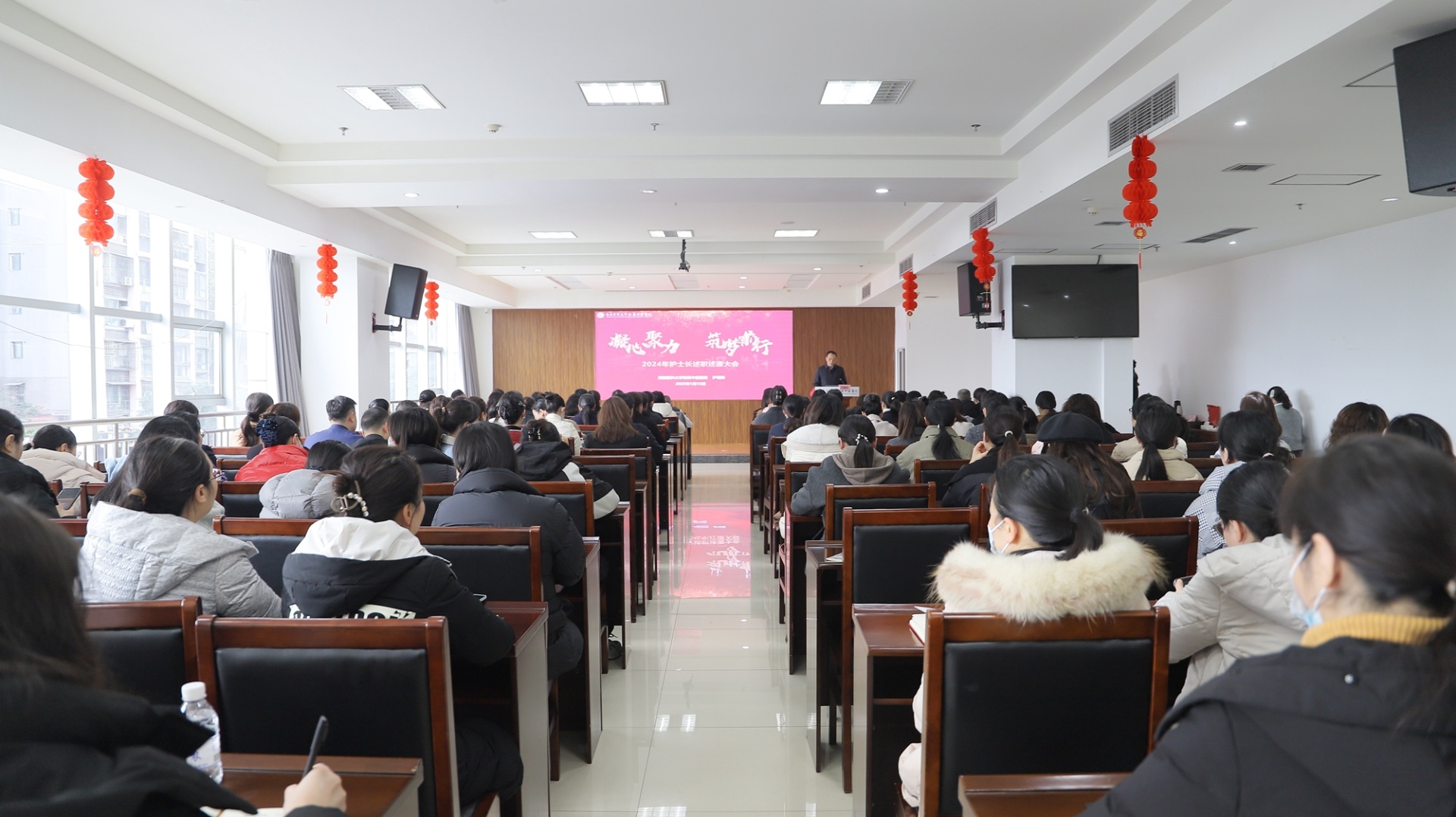 2025年1月15日,我院召开主题为“凝心聚力、筑梦前行”的2024年度护士长述职述廉会,医院党委书记代天祥,党委副书记雷学举,党委副书记、纪委书记鄢飞鹏,副院长张建堂、汪国友、董丽、张磊,相关职能部门负责人及各科室护士长等参加了会议。会议由汪国友主持。