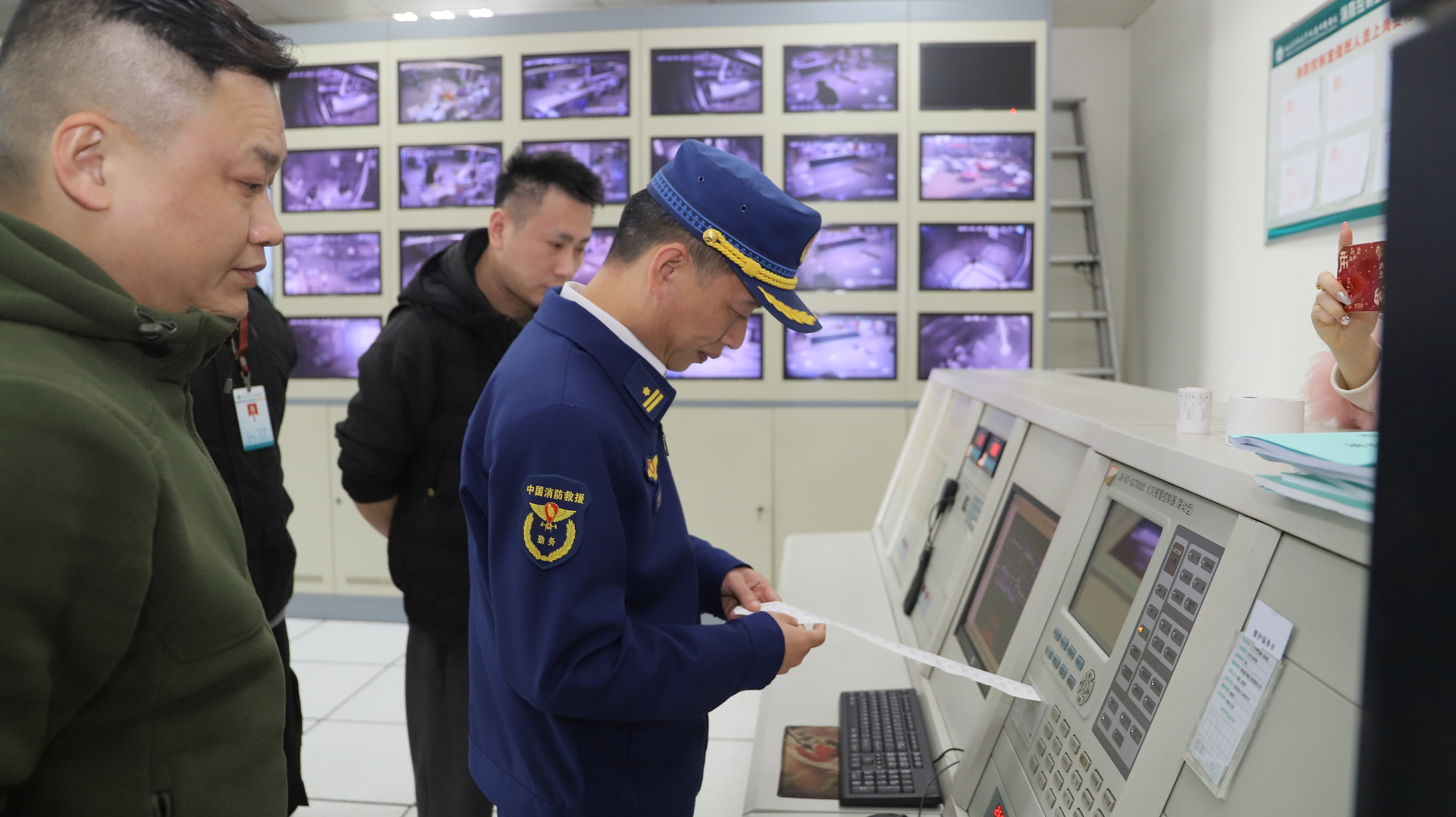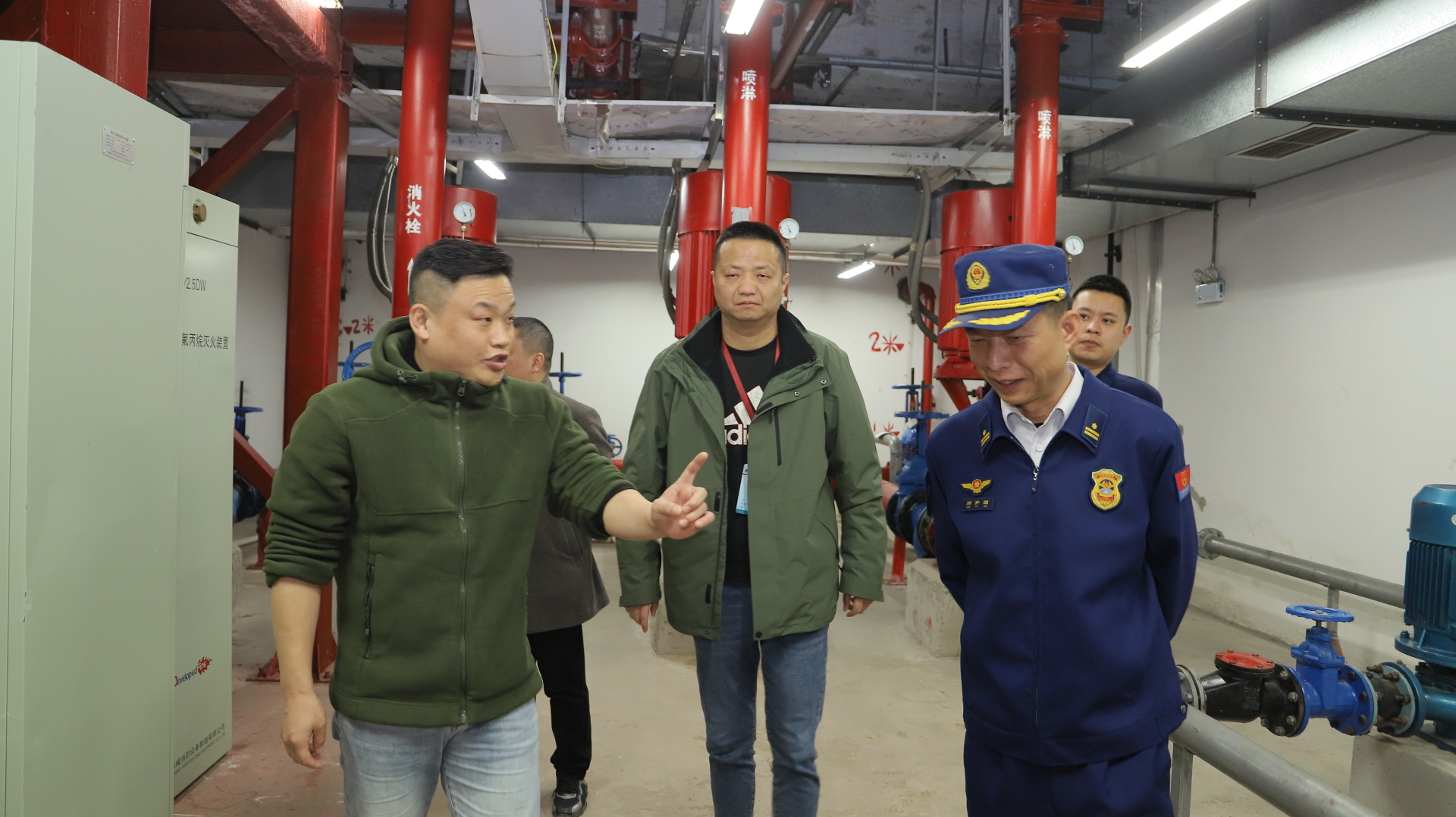我院保卫部部长张玉刚介绍了医院消防工作开展情况;龙马潭区消防大队邓开国大队长一行实地调研了我院二期消防控制室和消防泵房等重点部位运行情况。