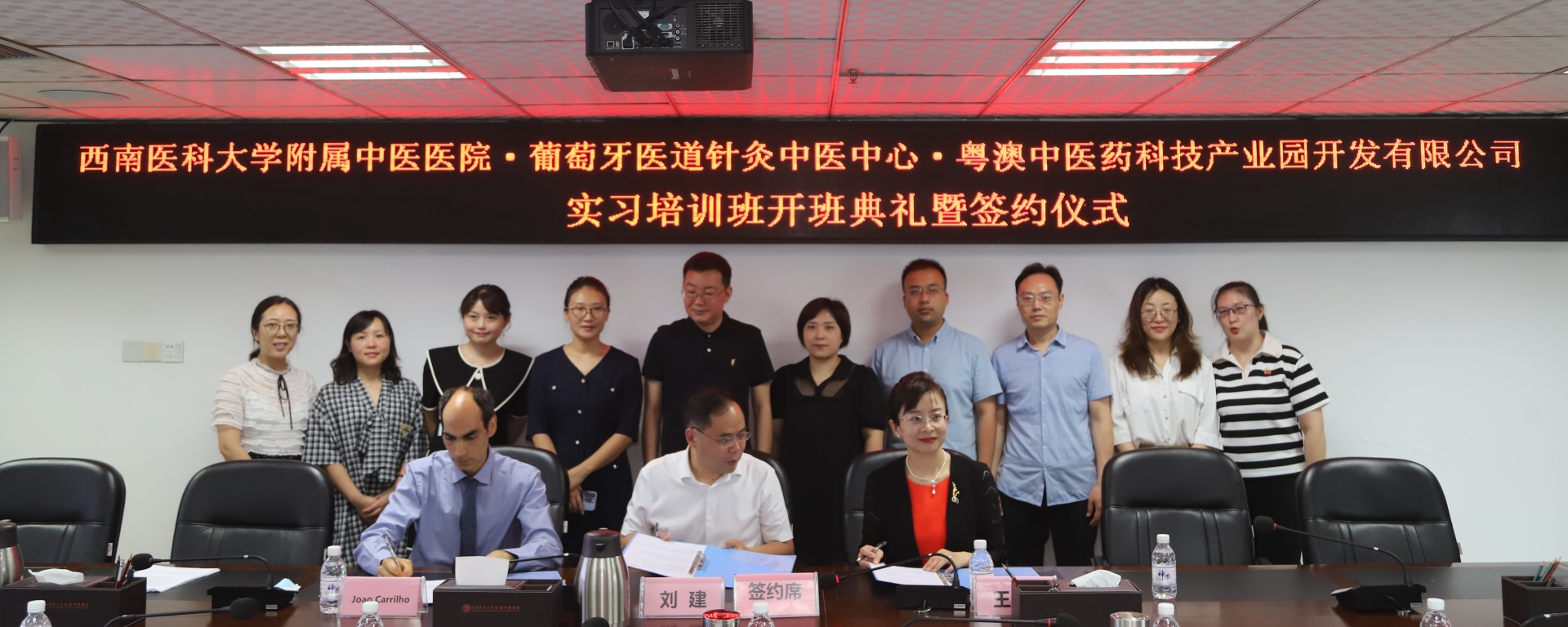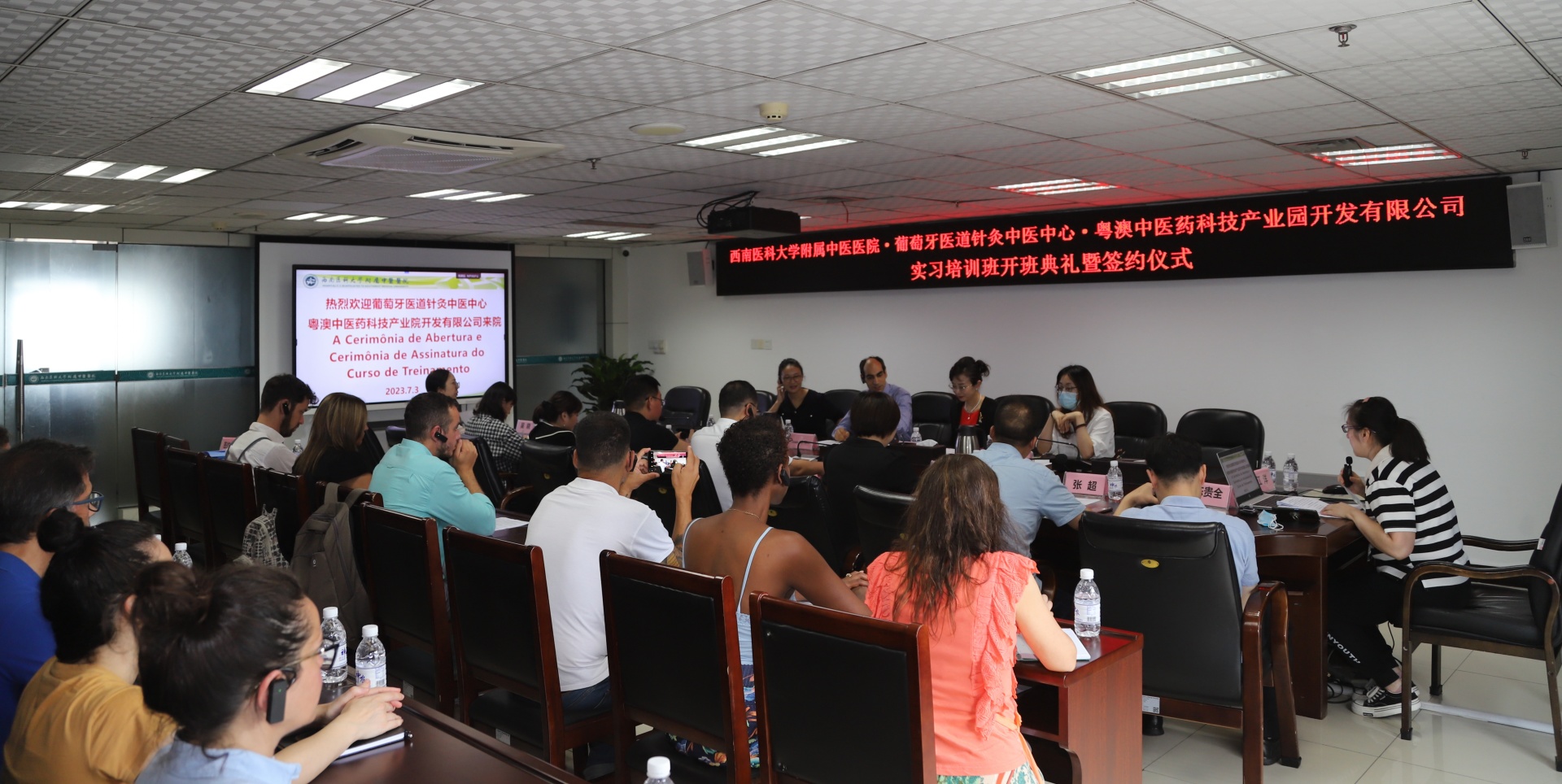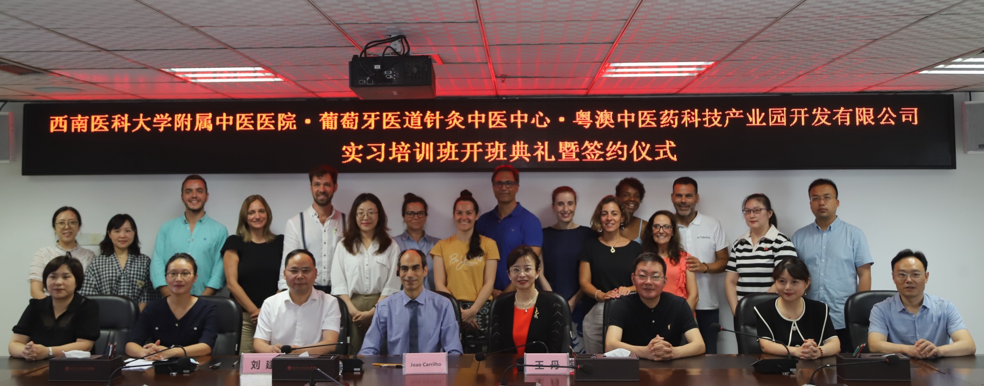 2023年7月3日,我院举行葡萄牙医道针灸中医中心实习培训班开班典礼暨签约仪式。葡萄牙医道针灸中医中心主任Joao Carrilho、粤澳中医药科技产业园开发有限公司董事兼副总经理王丹,我院院长刘建、副院长徐厚平、相关职能部门负责人及培训班学生等参加了会议。会议由徐厚平主持。