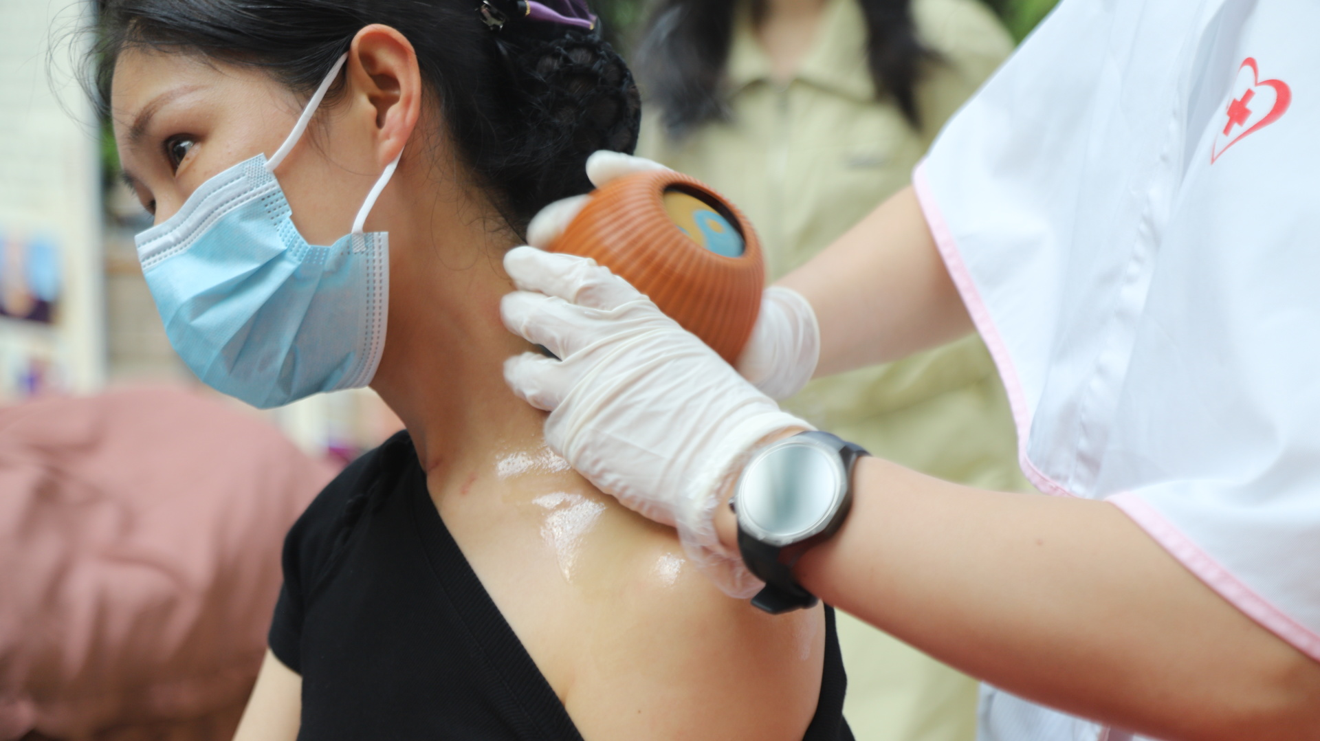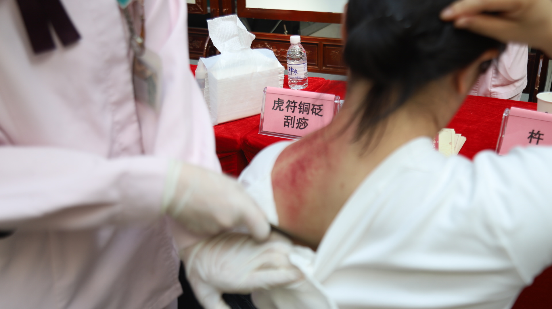 义诊现场,专家们为患者答疑解惑、指导体质养护,同时免费提供了虎符铜砭刮痧、杵针、火龙罐、牛角罐、耳穴压豆等中医特色技术体验。
