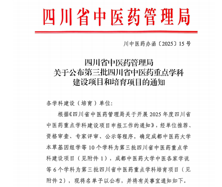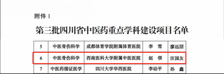 近日,四川省中医药管理局正式发布《关于公布第三批四川省中医药重点学科建设项目和培育项目的通知》,我院牵头申报的“中医骨伤科学”获批四川省中医药重点学科建设项目。