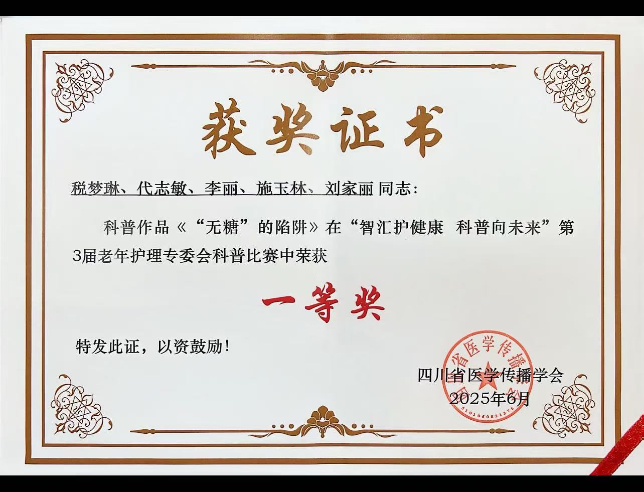 大会期间,会议主办方对10部优秀科普视频进行了展播,并为优秀作品颁发了一、二、三等奖、最佳组织奖和特别贡献奖。我院综合内科护理人员税梦琳、代志敏、李丽、施玉林、刘家丽拍摄制作的科普作品《“无糖”的陷阱》获一等奖。