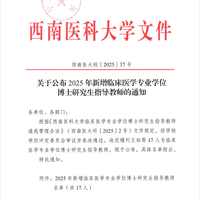 近日,西南医科大学发布了《关于公布2025年新增临床医学专业学位博士研究生指导教师的通知》,我院疼痛科主任刘庆教授、麻醉科主任兼疼痛科副主任张英教授被增列为临床医学专业学位博士研究生指导教师。