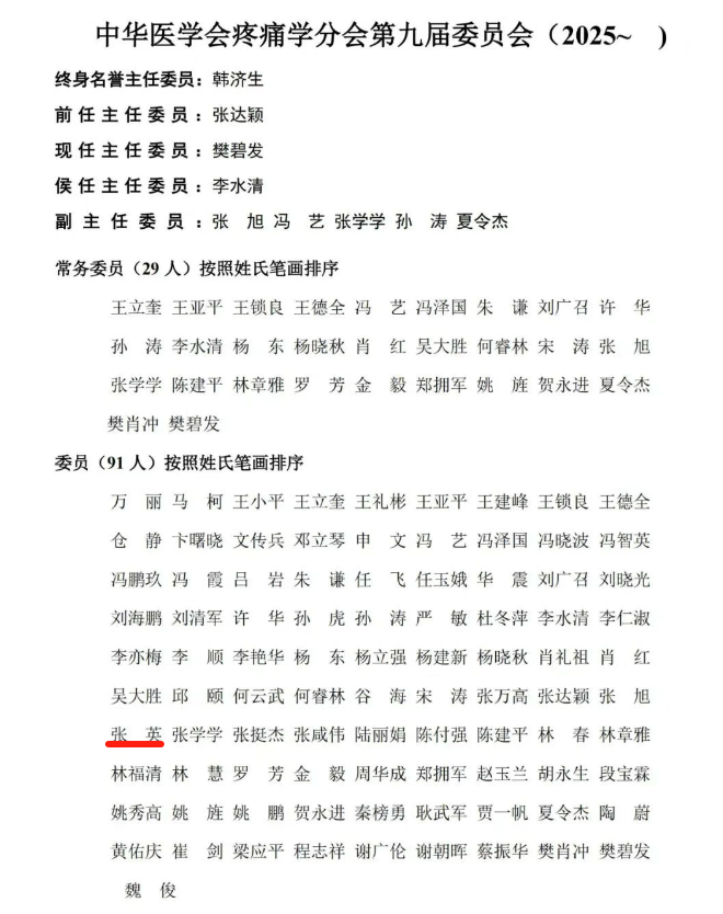 近日,中华医学会疼痛学分会换届大会召开,我院麻醉科主任兼疼痛科副主任张英教授当选为分会第九届委员会委员。