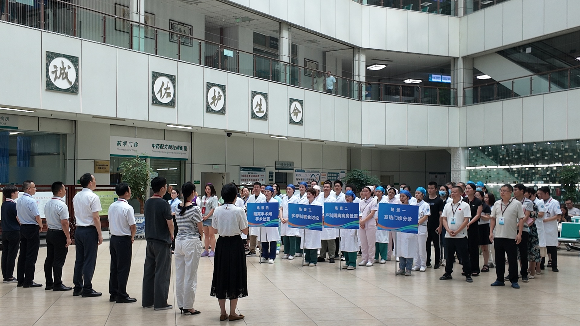 随后进行实战场景演练。我院院长汪国友担任演练总指挥,副院长董丽担任副总指挥,医务部部长石厚银担任现场指挥组组长。实战场景演练设置了发热门诊处置、产科隔离病房处置、多学科联合讨论、隔离手术室手术四个场景。通过演练检验中心的应急响应能力、多学科协作水平和整体救治流程。