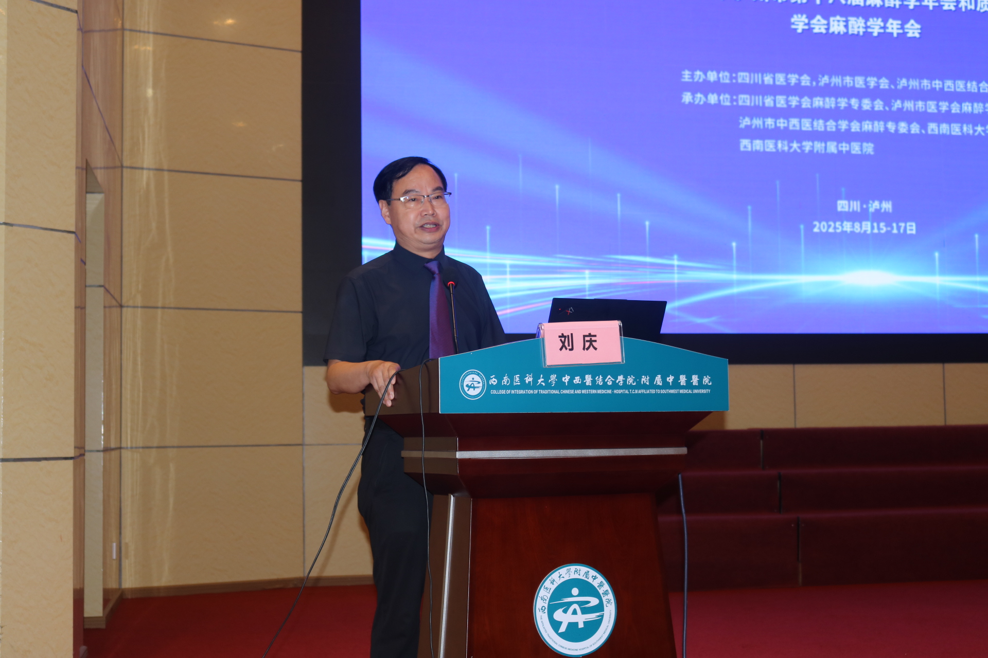 代天祥致辞。他介绍了医院的基本情况及我院麻醉学科发展现状,并希望与会人员以此次会议为契机,进一步加强联络联系,分享学术成果,精进业务能力,进一步提升区域麻醉和疼痛学科诊疗水平和服务能力,推动泸州乃至周边区域的麻醉学与中西医结合麻醉学事业不断迈上新台阶,为更好地保障人民群众的生命健康作出新的更大的贡献。
