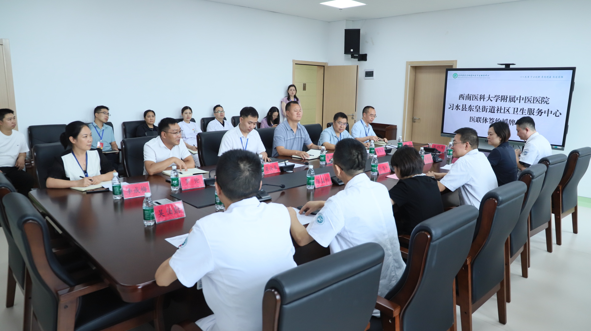 徐厚平讲话。他介绍了我院基本情况,表示我院将根据习水县东皇街道社区卫生服务中心的合作需求,在医院管理、医疗技术、科研教学等方面给予该中心指导和帮扶,提升合作单位医疗服务能力和水平,为习水县人民群众提供更优质的中医药健康服务。