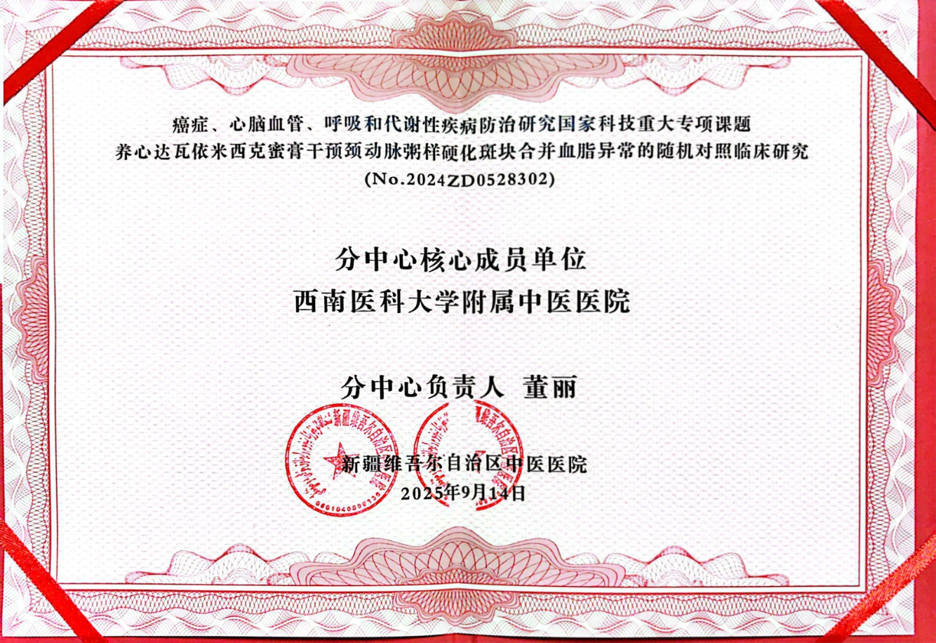 9月13-14日,癌症、心脑血管、呼吸和代谢性疾病防治研究国家科技重大专项课题“养心达瓦依米西克蜜膏干预颈动脉粥样硬化斑块合并血脂异常的随机对照临床研究”课题启动会在新疆乌鲁木齐召开,我院成为子课题分中心研究单位,副院长董丽为分中心负责人。