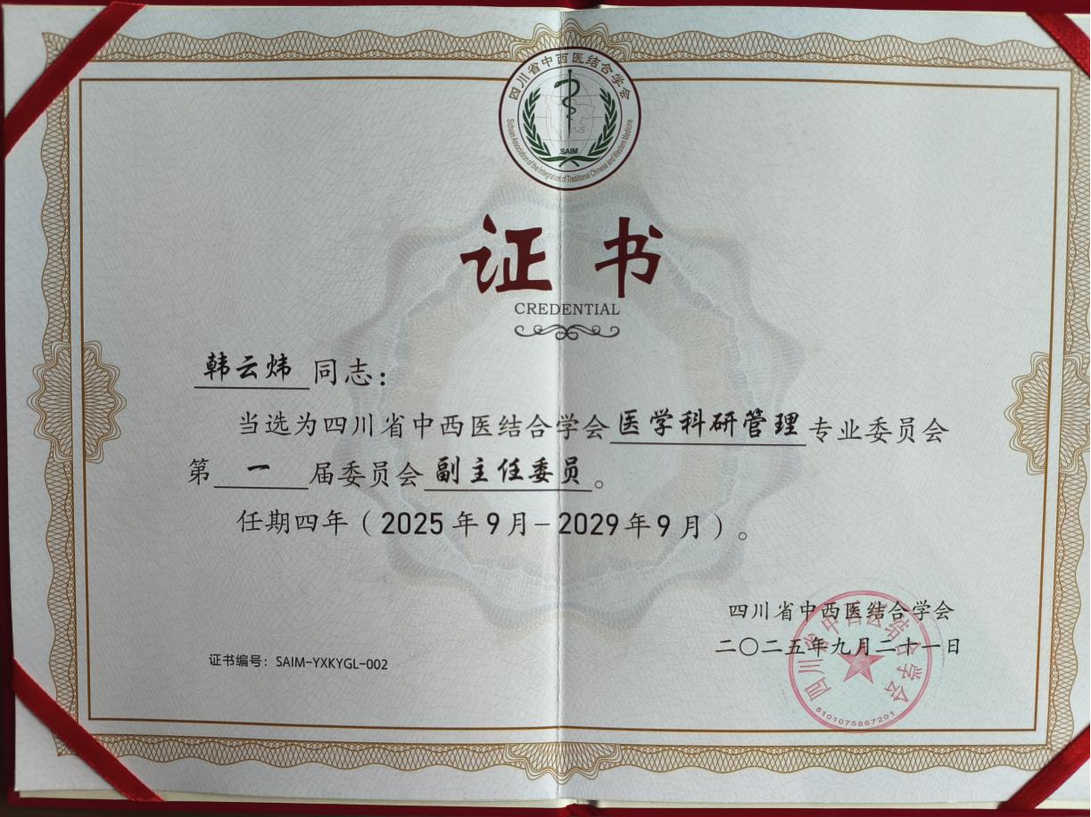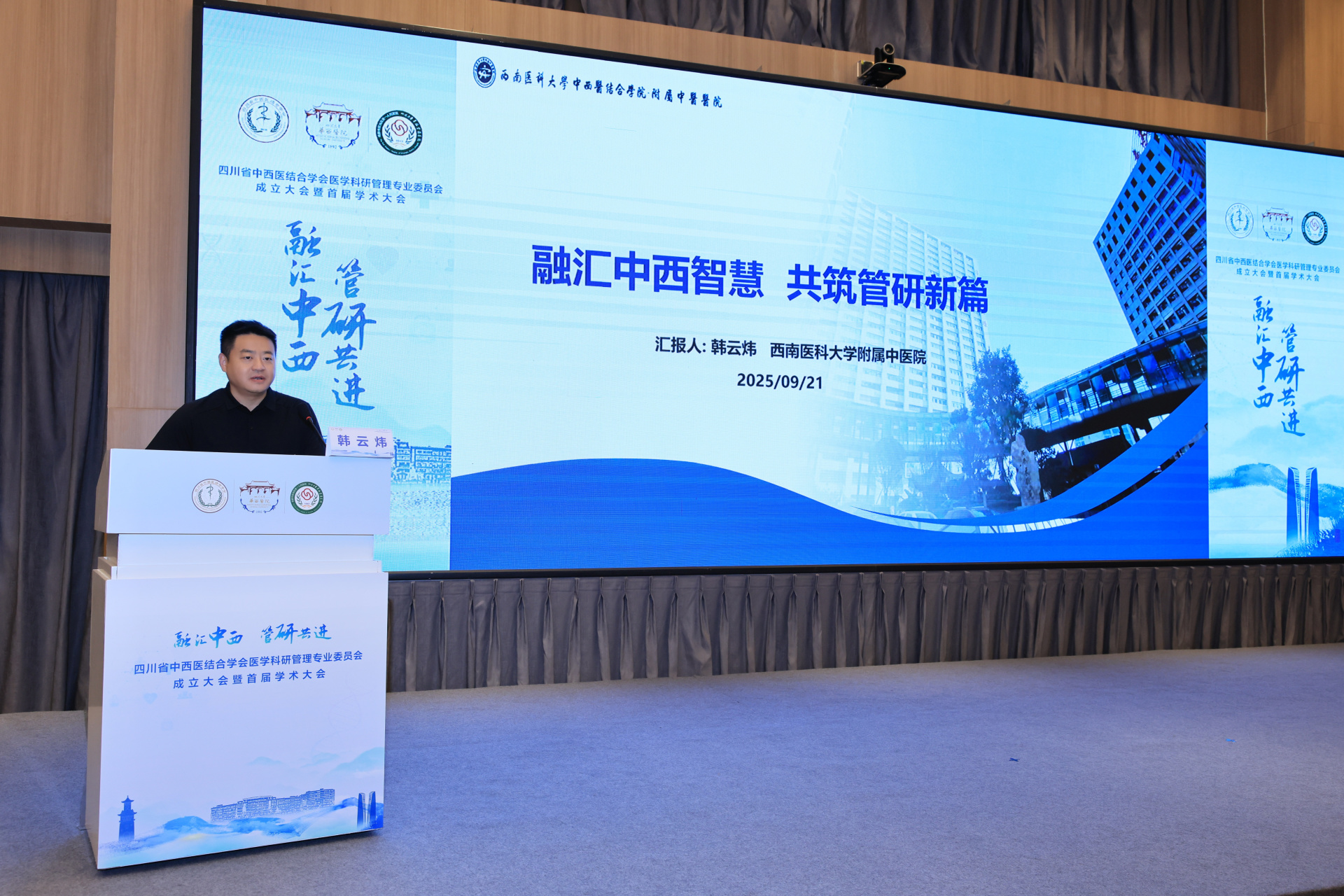 会上,韩云炜当选为四川省中西医结合学会医学科研管理专业委员会首届副主任委员,并以《融汇中西智慧,共筑管研新篇》为题作了专题讲座。