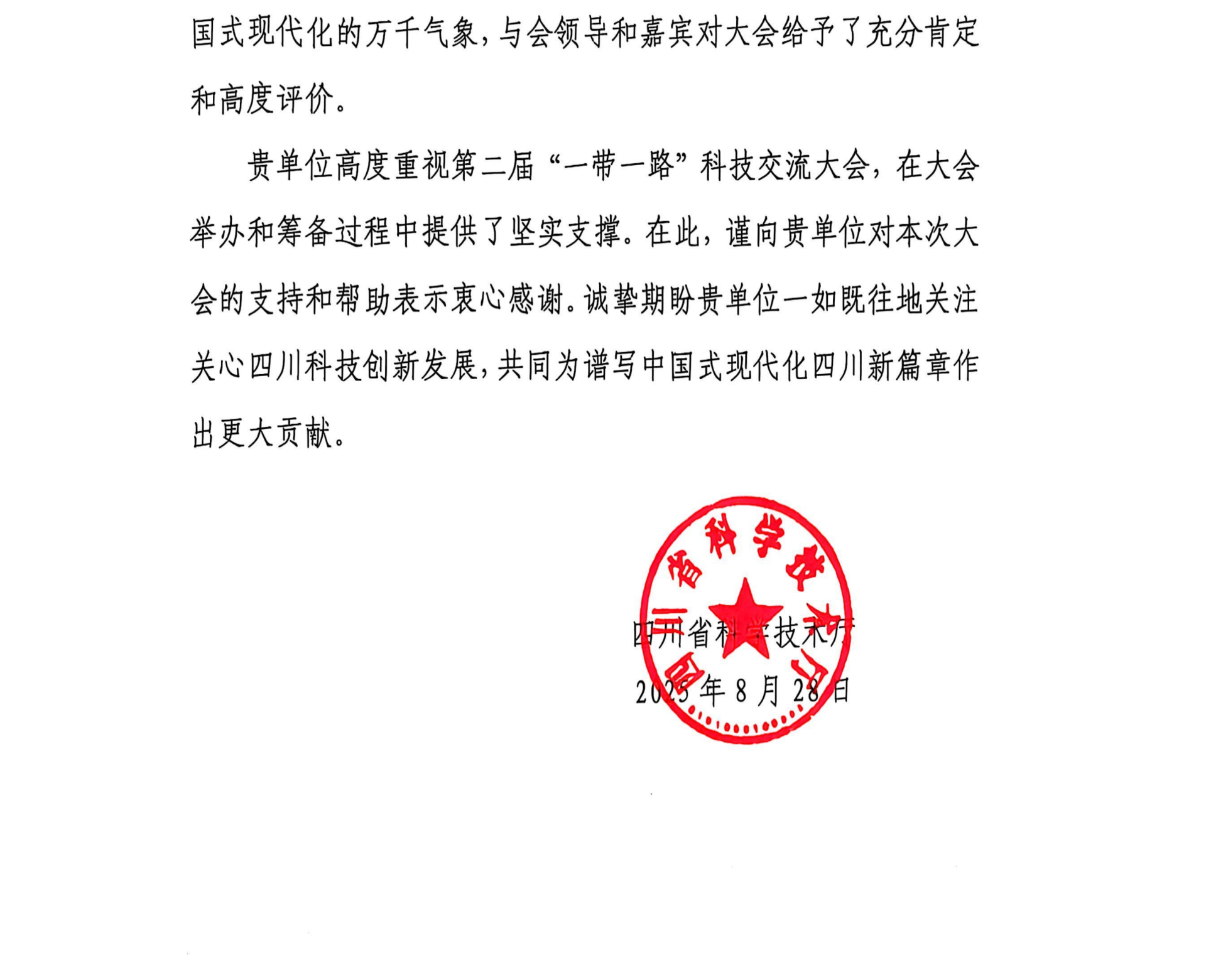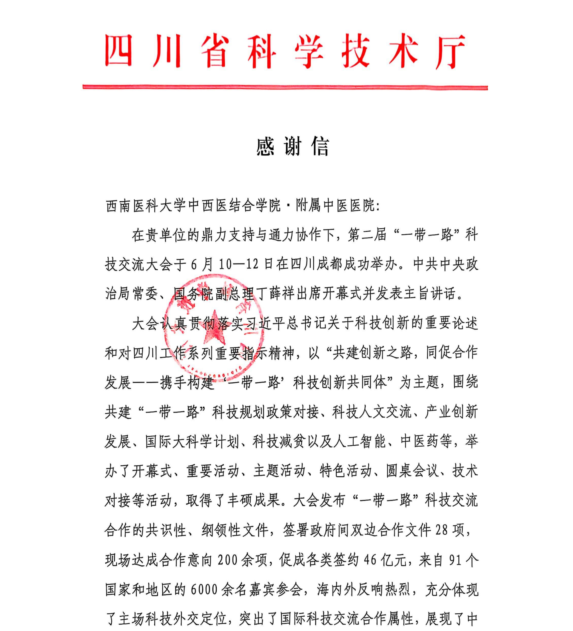 近日,我院收到四川省科学技术厅发来的感谢信,信中对医院在第二届“一带一路”科技交流大会筹备与举办过程中给予的支持表示感谢。