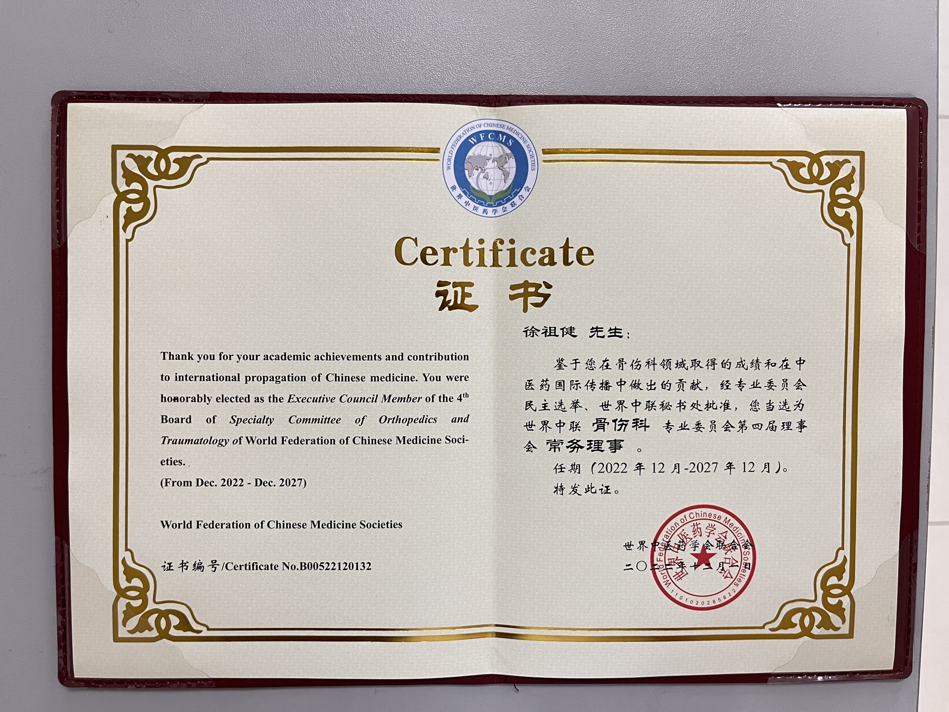 近日,世界中医药学会联合会骨伤科专业委员会第十三届学术大会换届会议召开,我院骨伤科关节·足踝组徐祖健教授当选为世界中联骨伤科专业委员会第四届理事会常务理事。