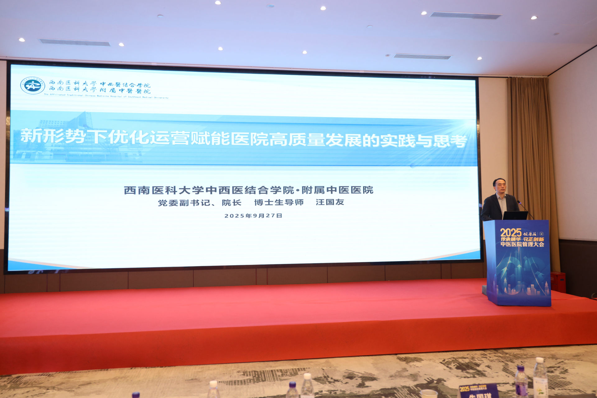 我院院长汪国友受邀以《新形势下优化运营赋能医院高质量发展的实践与思考》为题,在大会“优化运营,赋能医院高质量发展”专场上作了交流分享。他从以管理控成本筑牢高质量运营成本防线、以优势筑壁垒激活高质量运营差异引擎、以技术强支撑打造高质量运营智慧内核、以品牌树口碑夯实高质量运营信任基石、以学科聚合力凝聚高质量运营核心力量五个方面阐述了我院在优化运营赋能高质量发展方面的探索与思考,展现了我院在高质量发展上的清晰思路与扎实举措,得到了与会嘉宾的广泛认可。