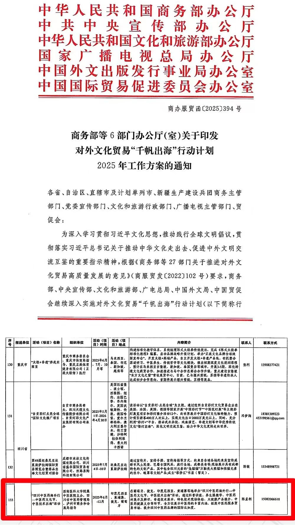 近日,商务部等六部委联合发布2025年“千帆出海”行动计划工作方案,由四川省中医药管理局与泸州市商务和会展局指导、我院主办的“四川中医药海外行—中医药文化节、中医技术出海”活动,成功入选年度重点活动清单。该项目是四川省唯一入选的中医药类活动,标志着四川中医药在服务国家战略、推动中华优秀传统文化“走出去”进程中迈出坚实步伐,充分彰显其在文化出海领域的重要地位与独特优势。