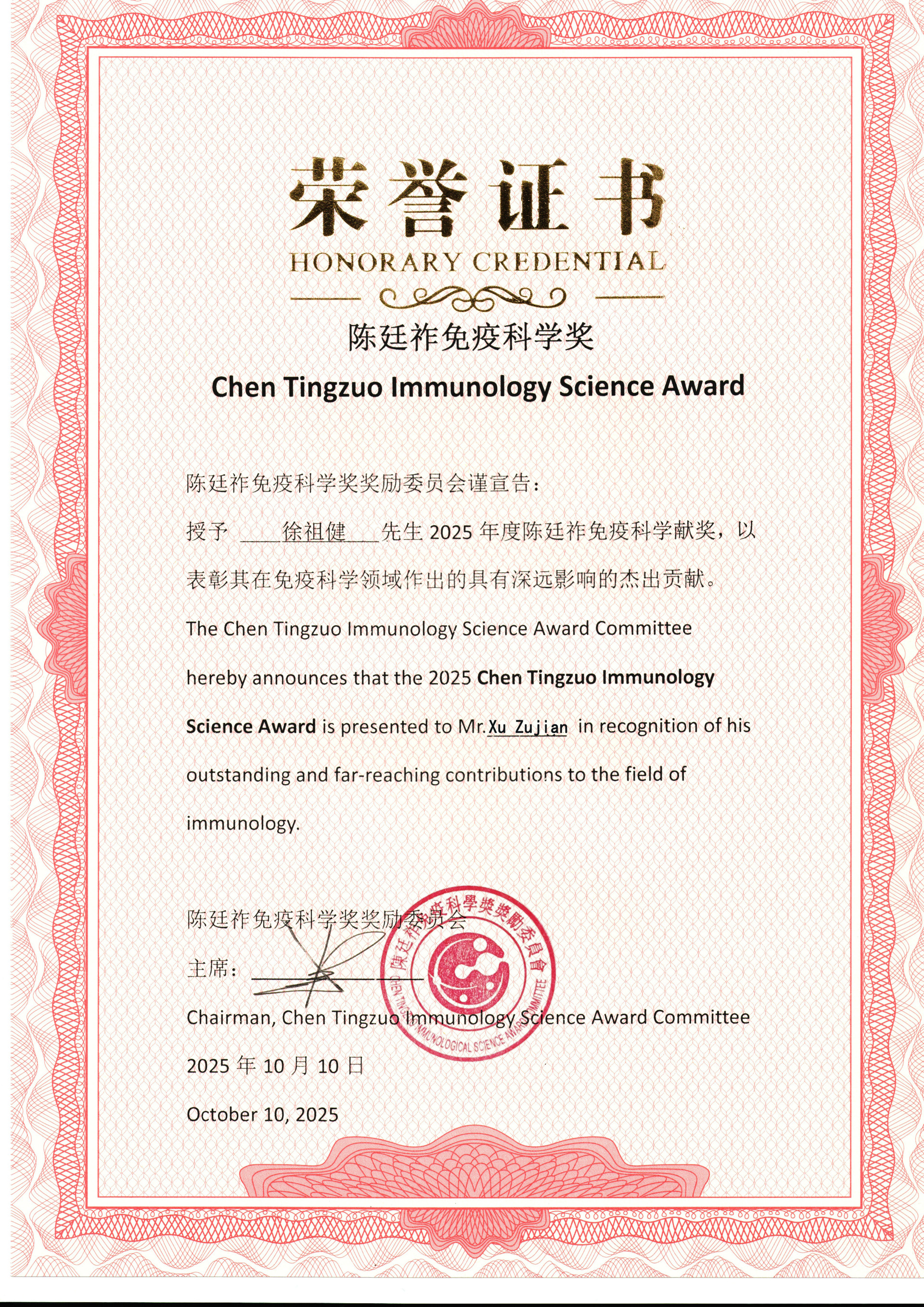 据悉,“陈廷祚免疫科学奖”由陈廷祚国际免疫科学基金会联合多家权威机构共同发起,是具有国际影响力的科学大奖。该奖项不仅是对获奖者个人成就的认可,更是中国在全球免疫科学与中医药领域构建国际话语体系的重要举措。该奖项致力于表彰领域内卓越学者,推动全球免疫科学研究与应用的发展。