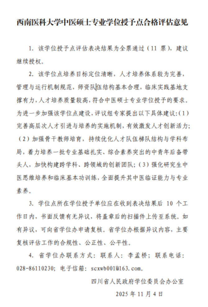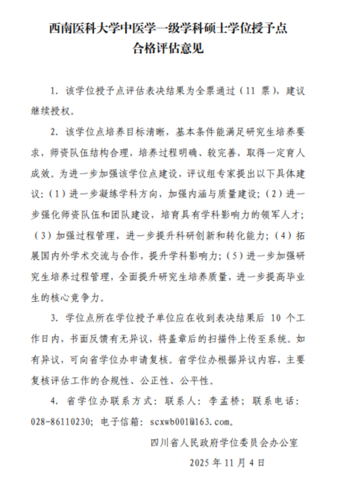 近日,四川省人民政府学位委员会办公室正式公布 2020-2025 年学位授予点周期性合格评估抽检结果。中西医结合学院参评的中西医结合一级学科、中医学一级学科及中医硕士专业学位 3 个硕士学位授予点,全部顺利通过本次周期性合格评估。其中,中医学一级学科与中医硕士专业学位 2 个授予点入选省级抽评名单。