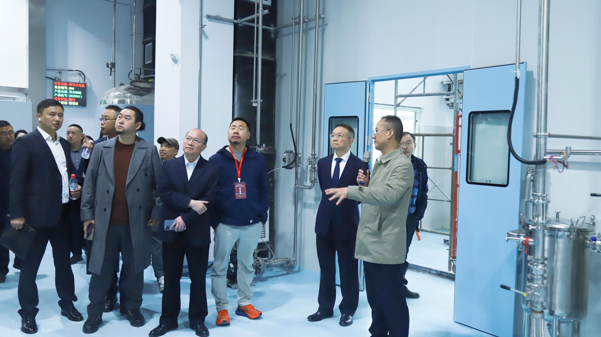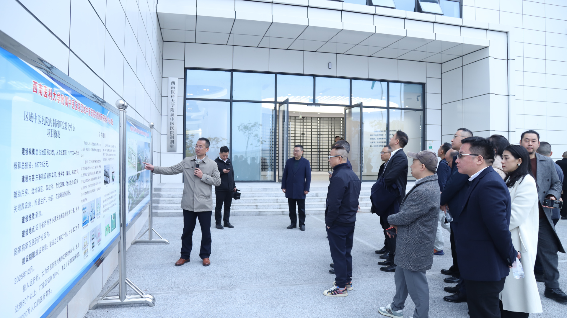 考察现场,代天祥向来宾介绍了项目整体规划与当前建设进展。随后在参观综合楼展厅、制剂车间及提取车间过程中,我院制剂室主任蒲清荣介绍了院内制剂的标准化生产流程与最新引进的智能化设备配置、各区域的功能定位与运行机制等。
