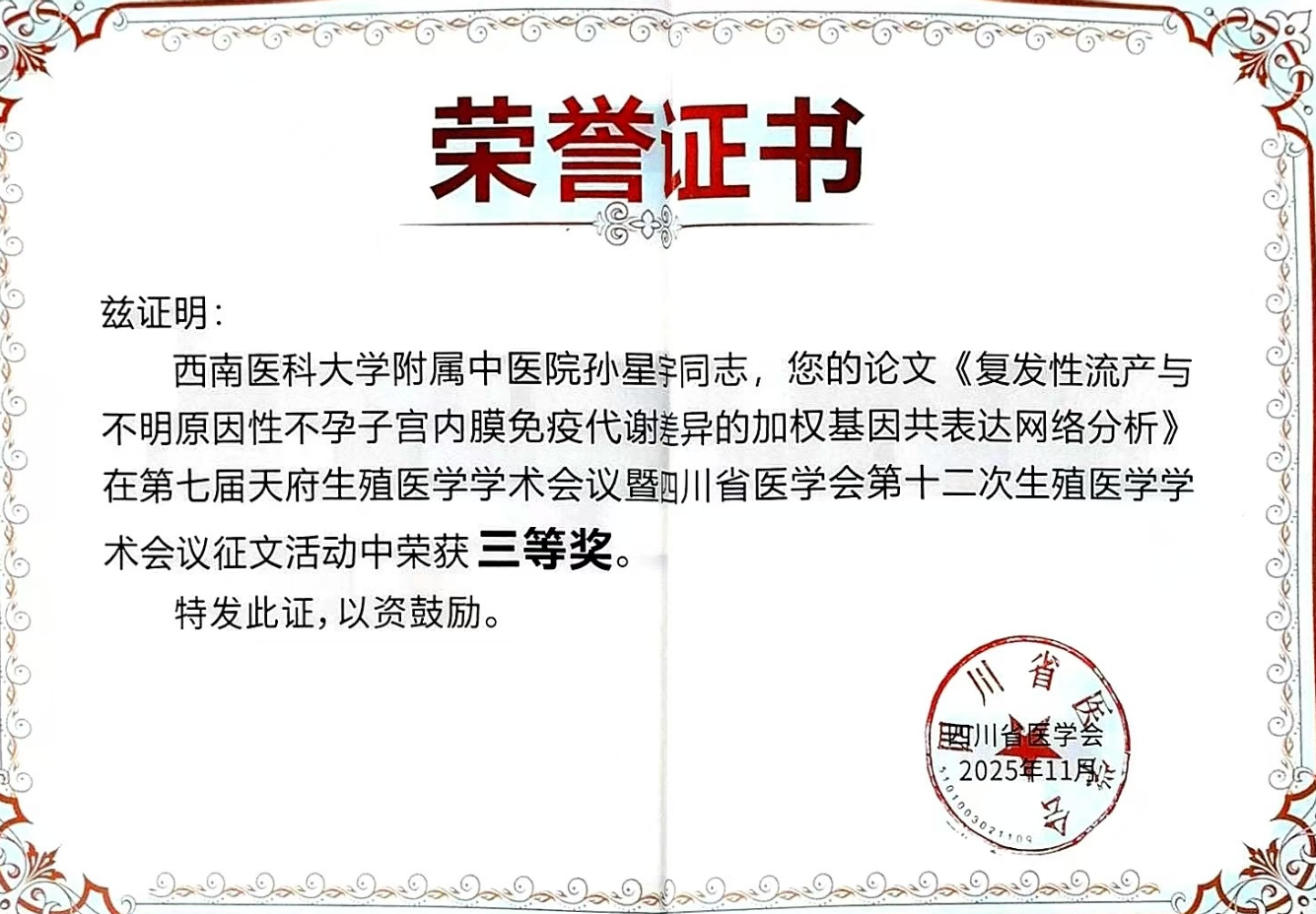 我院妇科孙星宇主治医师提交的论文《复发性流产与不明原因不孕子宫内膜免疫代谢差异的加权基因共表达网络分析》获大会优秀论文三等奖。