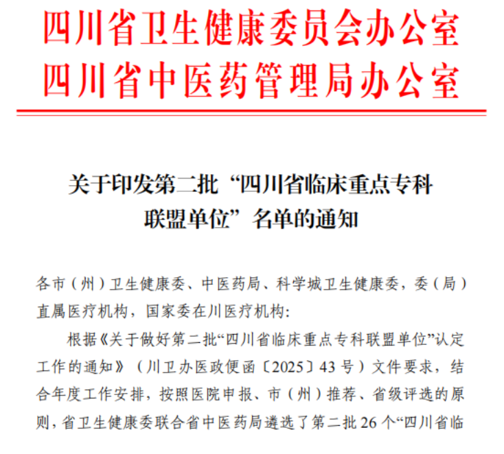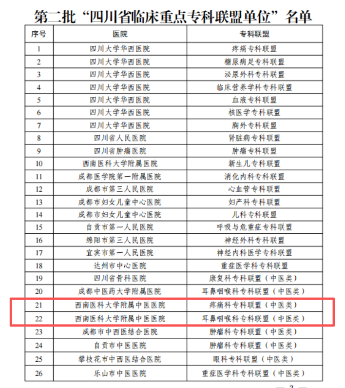 近日,四川省卫生健康委员会与四川省中医药管理局联合发布《关于第二批“四川省临床重点专科联盟单位”名单的通知》。我院疼痛科(中医类)和耳鼻咽喉科(中医类)专科联盟成功入选第二批“四川省临床重点专科联盟单位”。