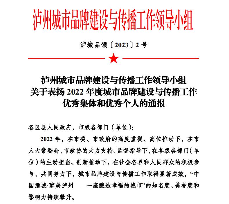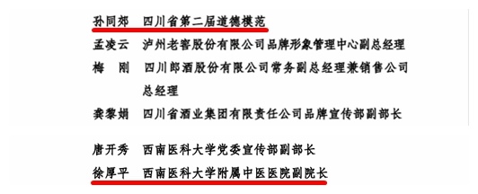 近日,泸州城市品牌建设与传播工作领导小组发布了《关于表扬 2022 年度城市品牌建设与传播工作优秀集体和优秀个人的通报》,全国名中医、我院肝胆病科专家孙同郊教授,副院长徐厚平教授获评“泸州市2022年度城市品牌建设与传播工作优秀个人”。
