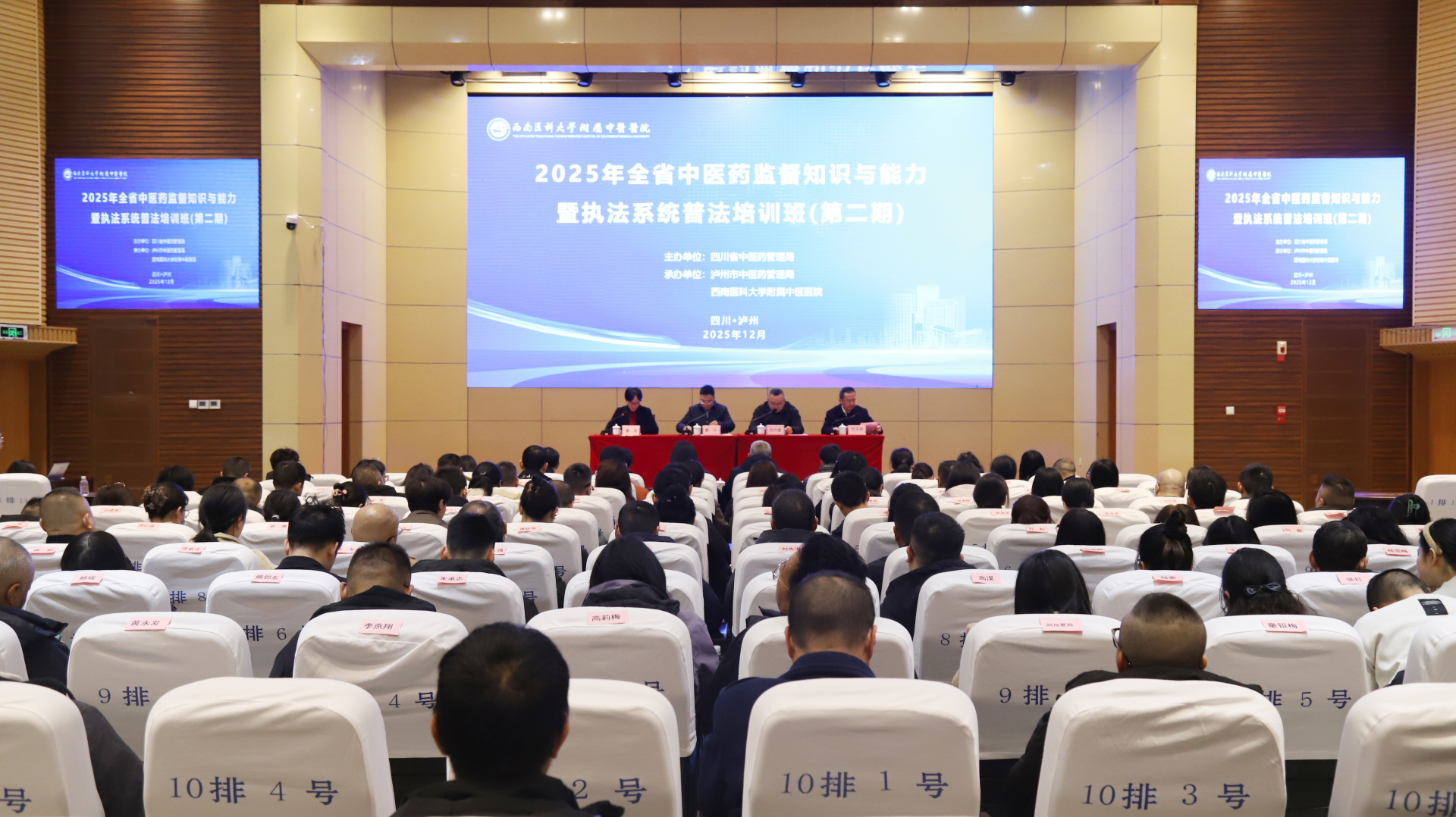 12月4-5日,我院作为国家中医药监督执法实训基地建设单位,组织召开了“2025年全省中医药监督知识与能力暨执法系统普法培训班(第二期)”。四川省中医药管理局政策法规处三级调研员白兴盛、四川省卫生健康委执法监督局中医支队队长周涛、泸州市卫生健康委员会副主任费宁、泸州市卫生和计划生育监督执法支队长黄亚南、我院党委书记代天祥、副院长董丽,相关授课专家,省内各市(州)、县(区)三级的中医药监督执法人员共计110人参加了为期两天的集中理论学习与实训,开幕式由董丽主持。