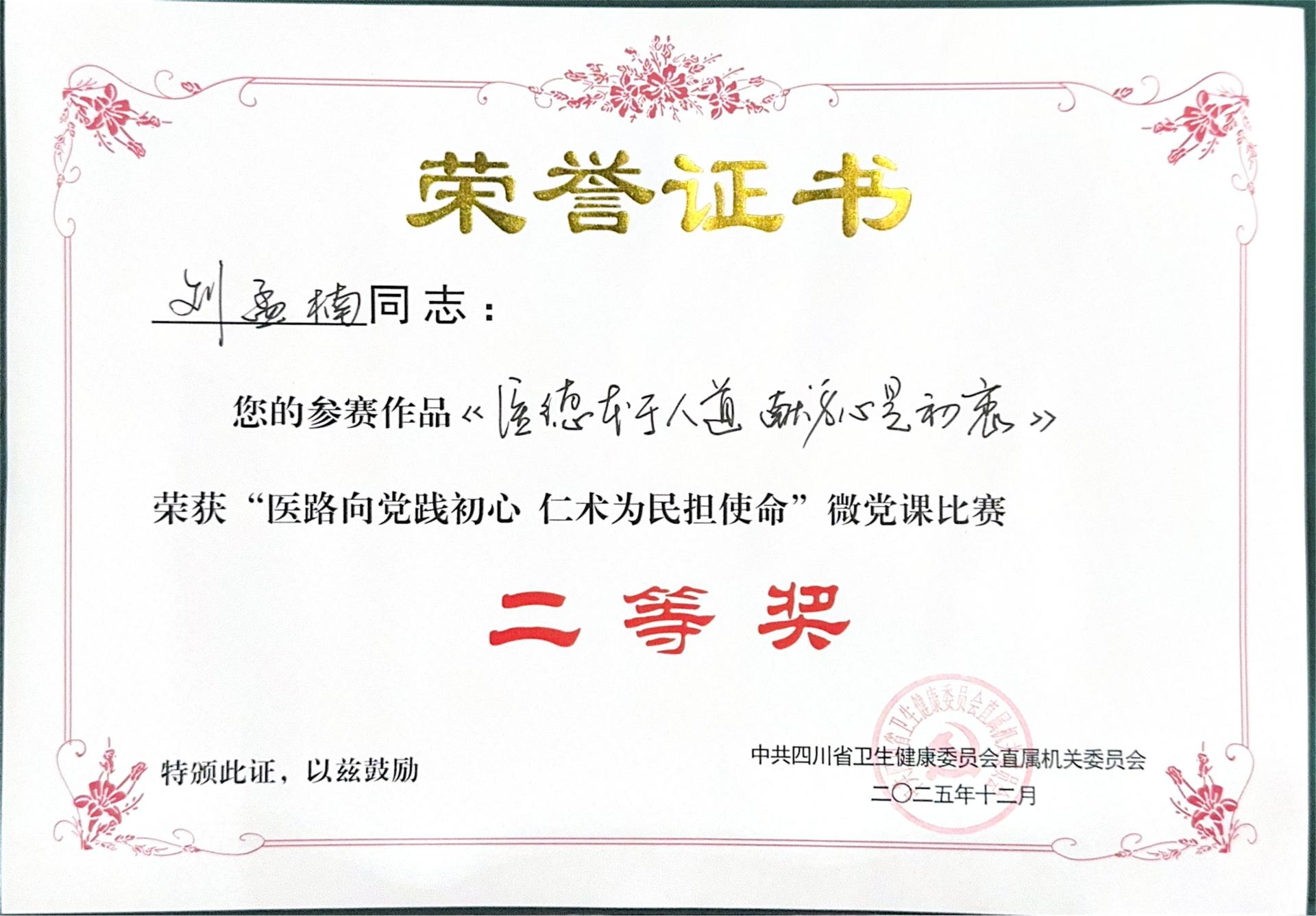 活动中,心血管内科党支部刘孟楠同志以《医德本于人道 献身必是初衷》为题讲的微党课荣获大赛二等奖。